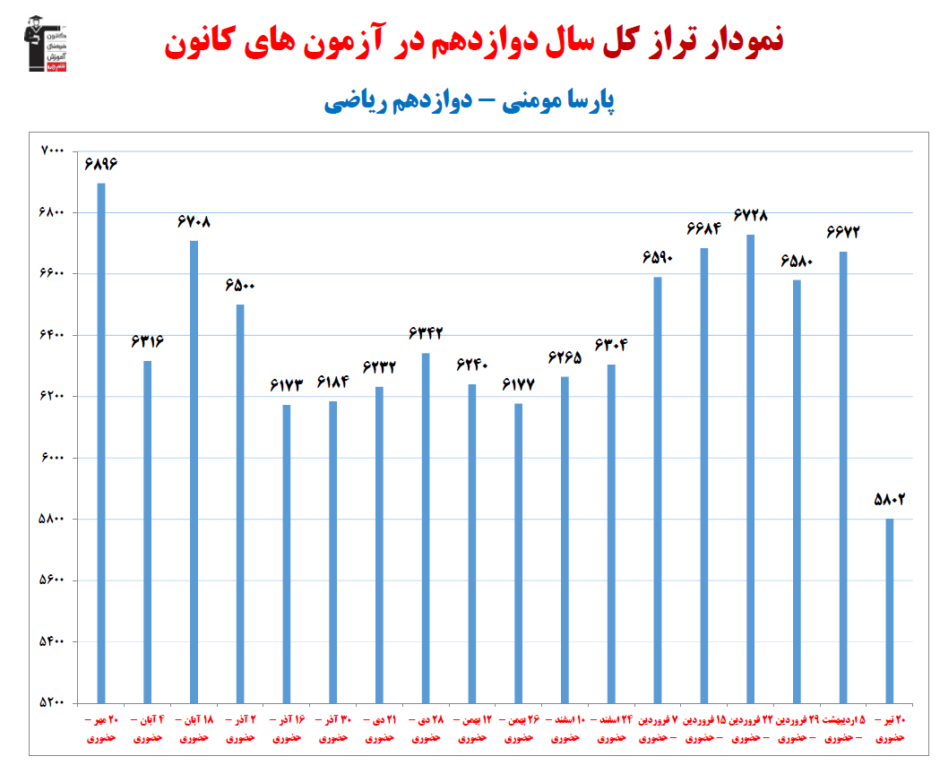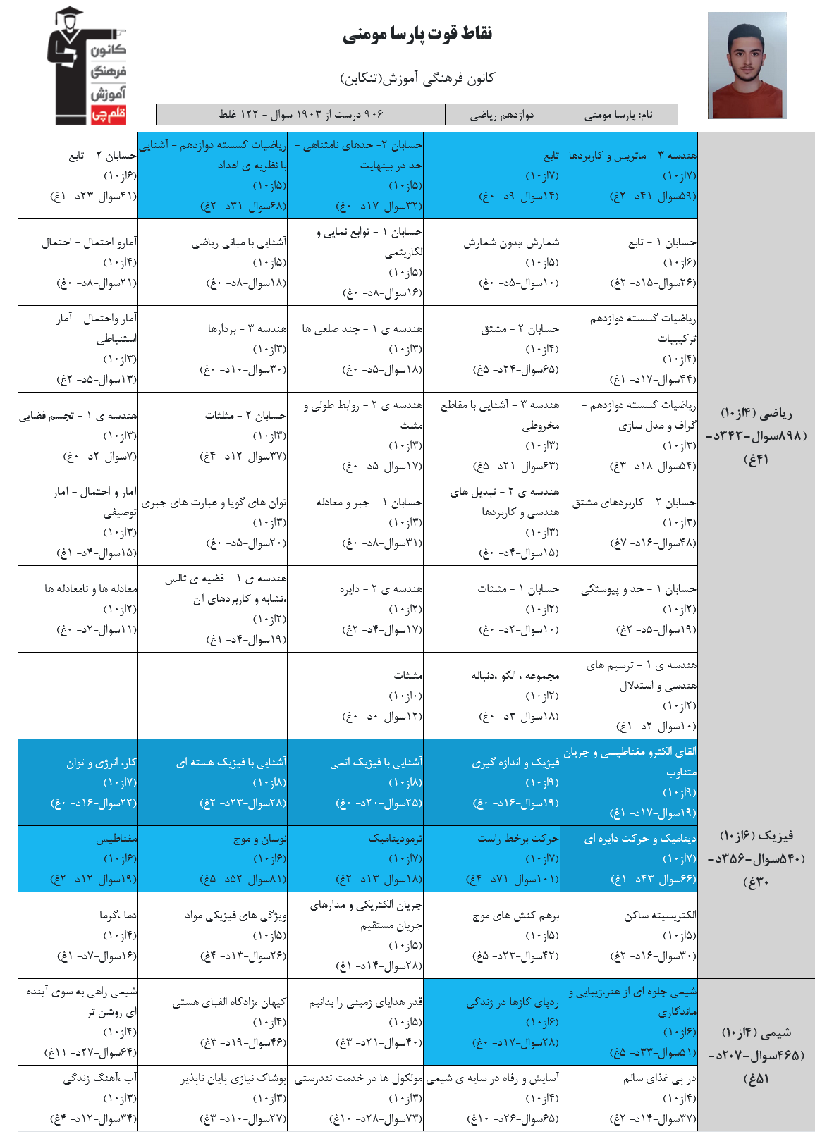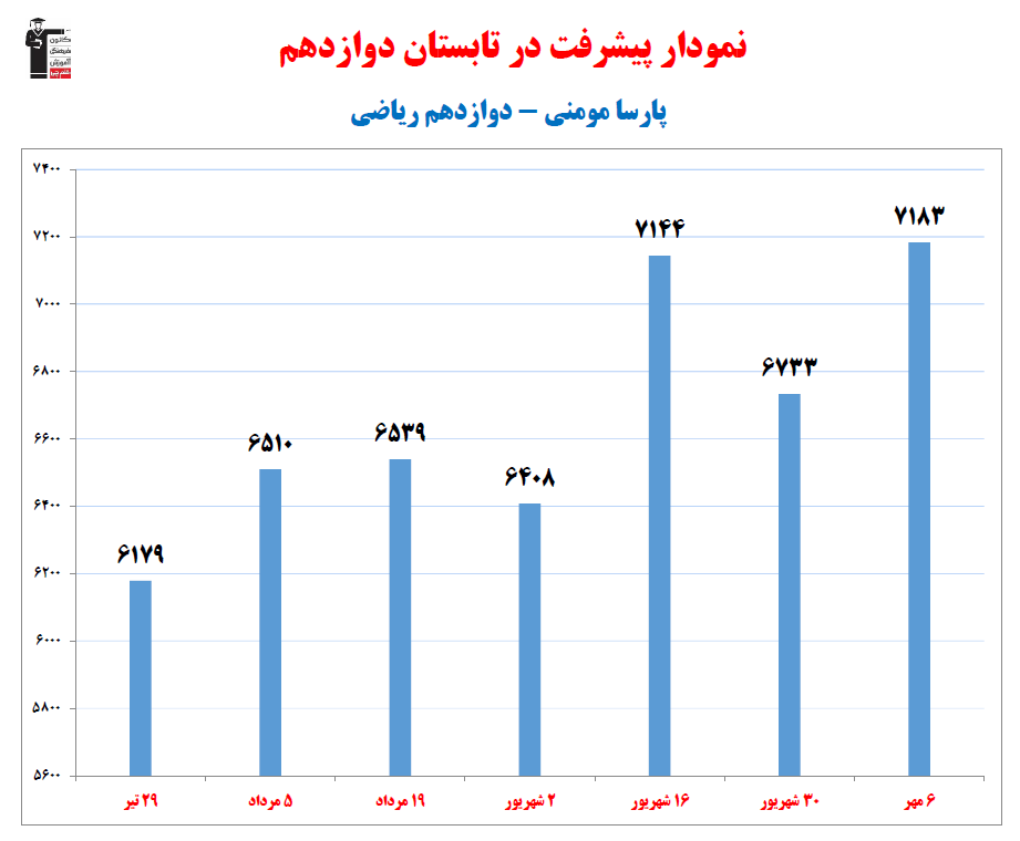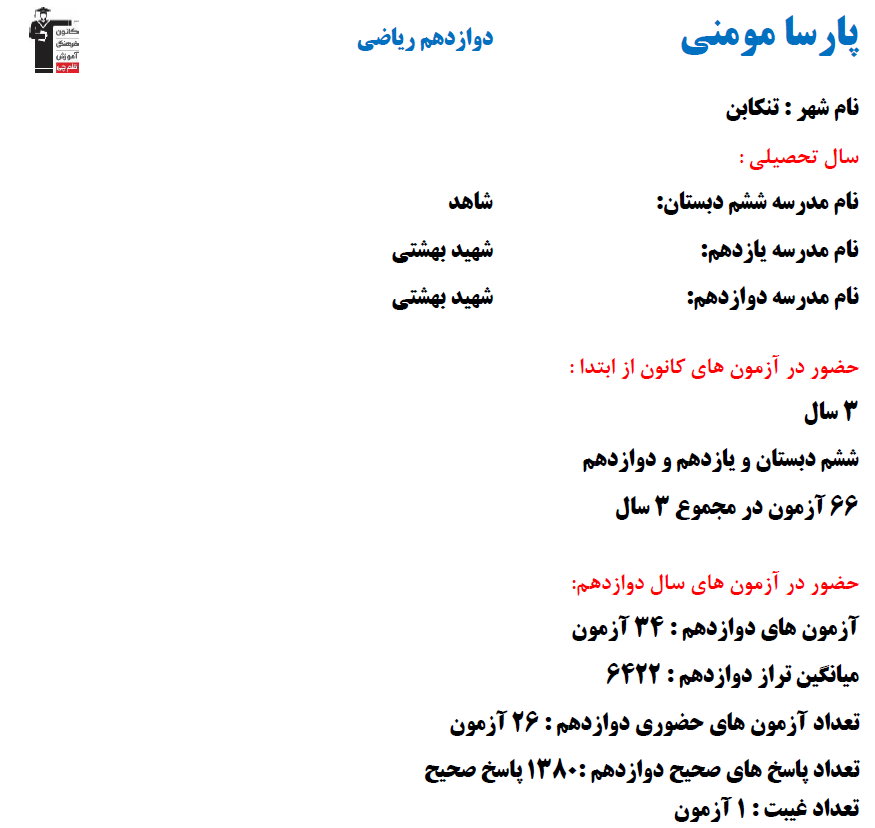 در ادامه میتوانید عملکرد درسی پارسا مومني را در کانون مشاهده کنید.نمودار پیشرفت میانگین تراز در پایههای مختلف، نمودار تراز کل، عملکرد آزمونهای سال دوازدهم و شروع از تابستان و تراز آزمون های تابستان، کارنامههای مبحثی در نمودارها و تصاویر زیر قابل مشاهده است.