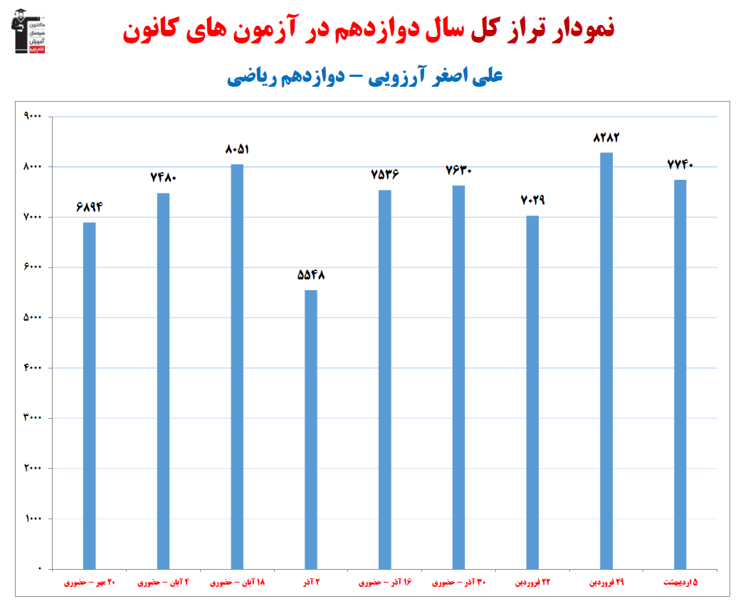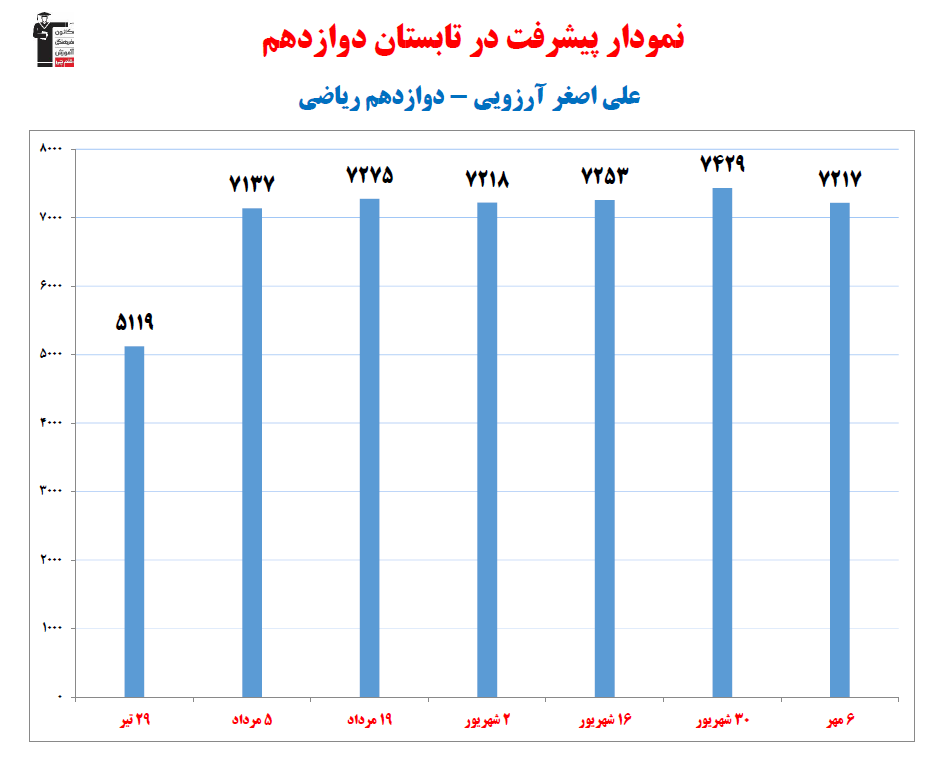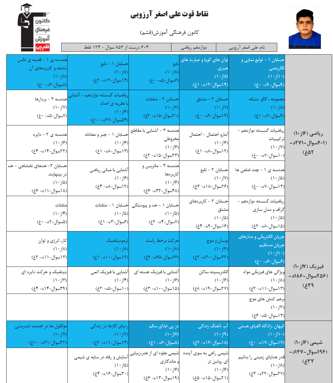 در ادامه میتوانید عملکرد درسی علي اصغر آرزويي را در کانون مشاهده کنید.نمودار پیشرفت میانگین تراز در پایههای مختلف، نمودار تراز کل، عملکرد آزمونهای سال دوازدهم و شروع از تابستان و تراز آزمون های تابستان، کارنامههای مبحثی در نمودارها و تصاویر زیر قابل مشاهده است.