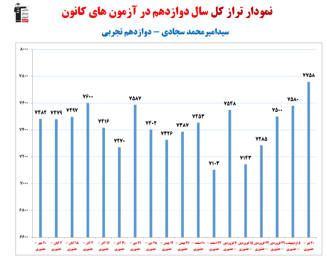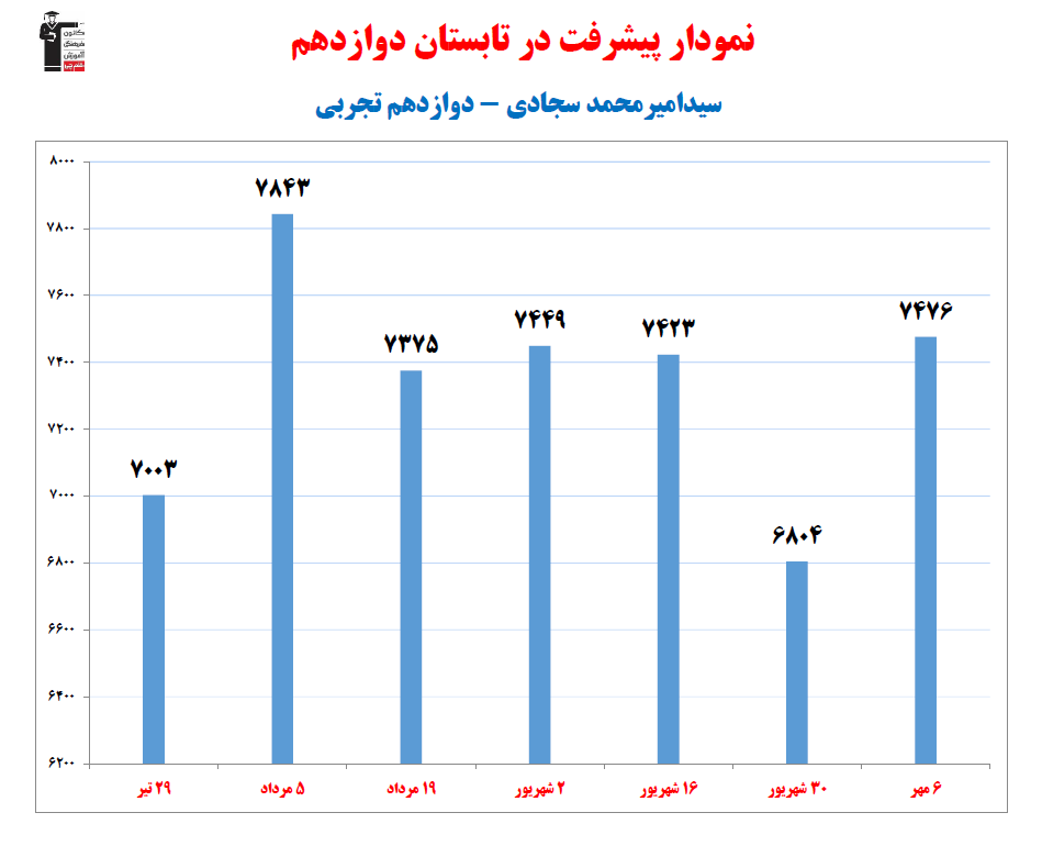 در ادامه میتوانید عملکرد درسی سيداميرمحمد سجادي را در کانون مشاهده کنید.نمودار پیشرفت میانگین تراز در پایههای مختلف، نمودار تراز کل، عملکرد آزمونهای سال دوازدهم و شروع از تابستان و تراز آزمون های تابستان، کارنامههای مبحثی در نمودارها و تصاویر زیر قابل مشاهده است.