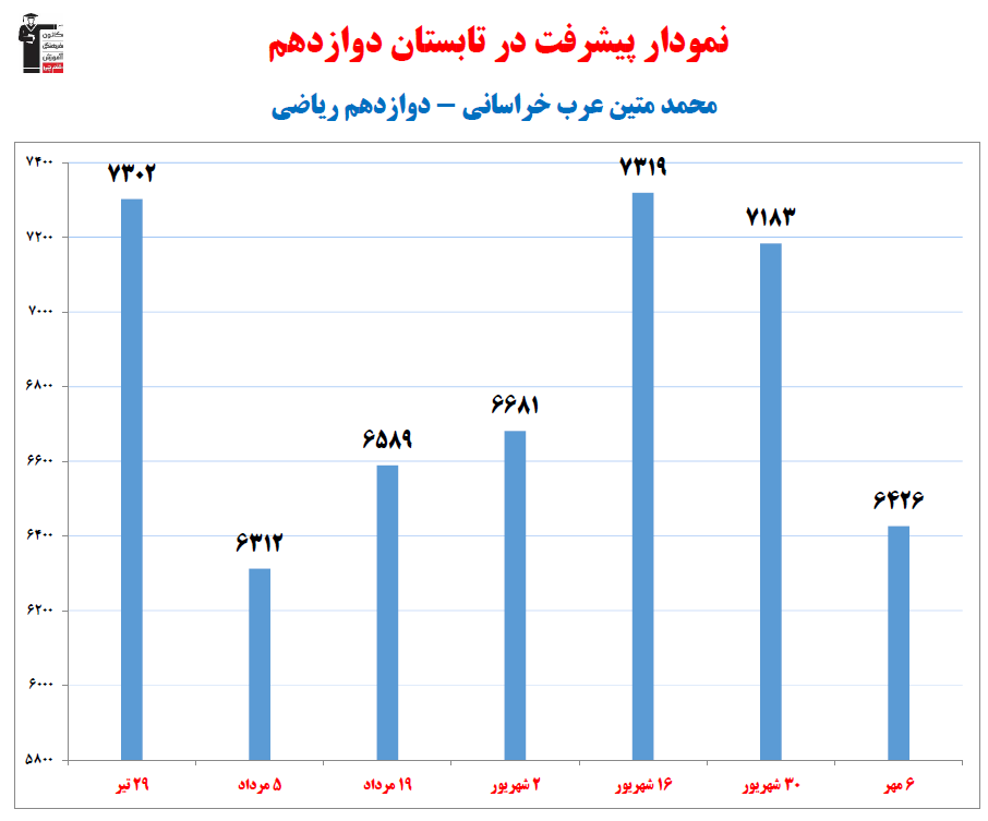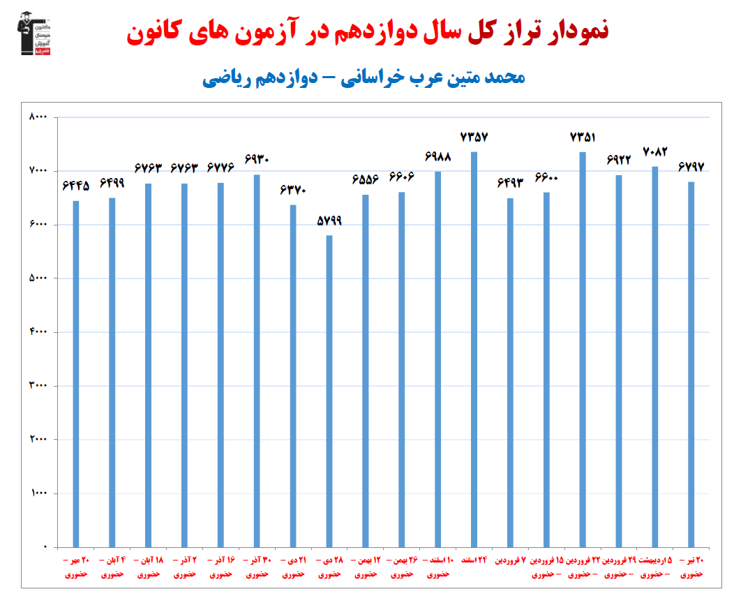 در ادامه میتوانید عملکرد درسی محمدمتين عرب خراسانی را در کانون مشاهده کنید.نمودار پیشرفت میانگین تراز در پایههای مختلف، نمودار تراز کل، عملکرد آزمونهای سال دوازدهم و شروع از تابستان و تراز آزمون های تابستان، کارنامههای مبحثی در نمودارها و تصاویر زیر قابل مشاهده است.