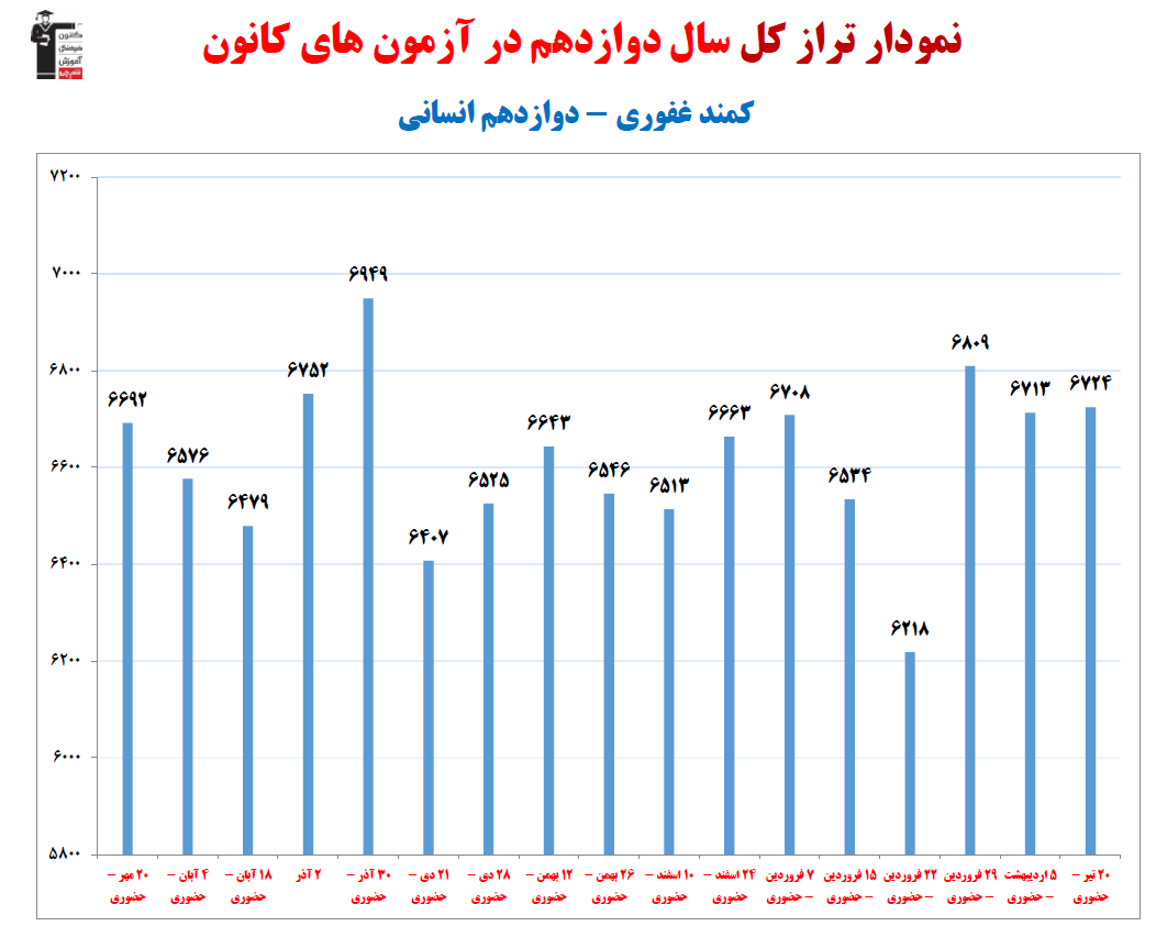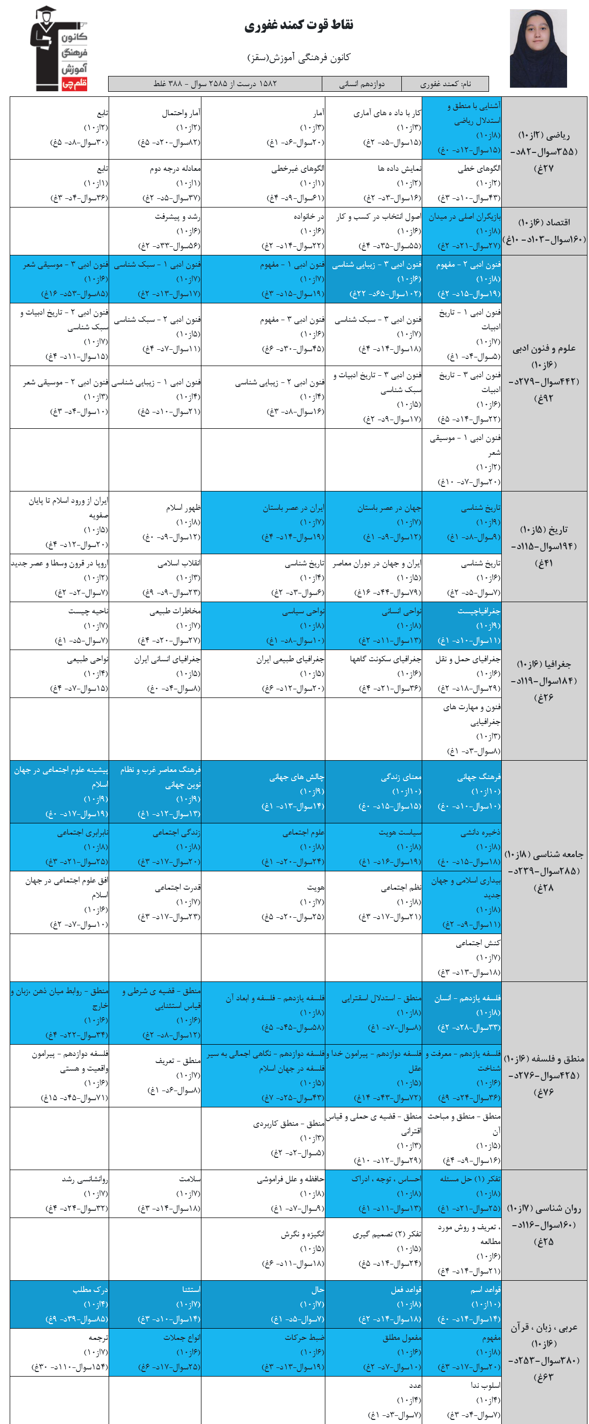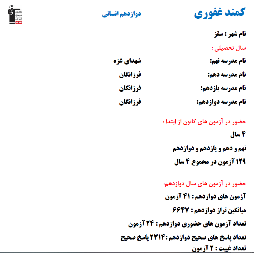 در ادامه میتوانید عملکرد درسی کمند غفوري را در کانون مشاهده کنید.نمودار پیشرفت میانگین تراز در پایههای مختلف، نمودار تراز کل، عملکرد آزمونهای سال دوازدهم و شروع از تابستان و تراز آزمون های تابستان، کارنامههای مبحثی در نمودارها و تصاویر زیر قابل مشاهده است.