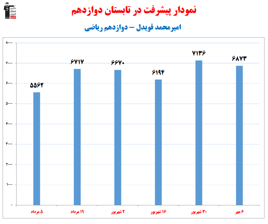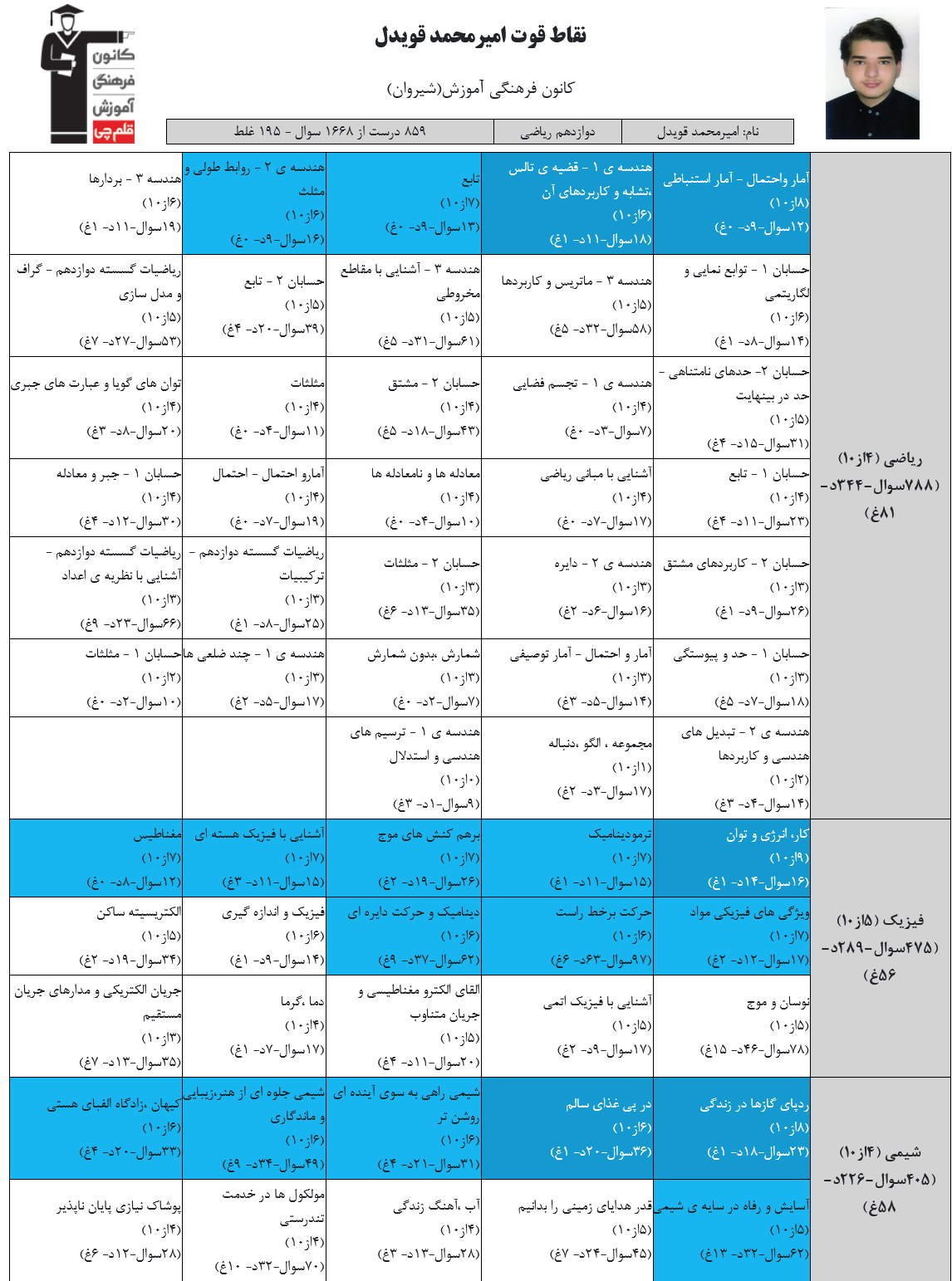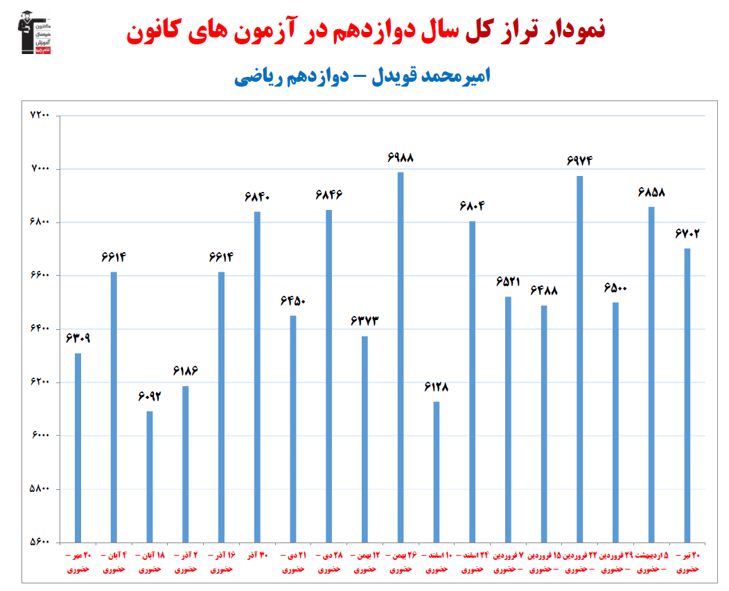 در ادامه میتوانید عملکرد درسی اميرمحمد قويدل را در کانون مشاهده کنید.نمودار پیشرفت میانگین تراز در پایههای مختلف، نمودار تراز کل، عملکرد آزمونهای سال دوازدهم و شروع از تابستان و تراز آزمون های تابستان، کارنامههای مبحثی در نمودارها و تصاویر زیر قابل مشاهده است.