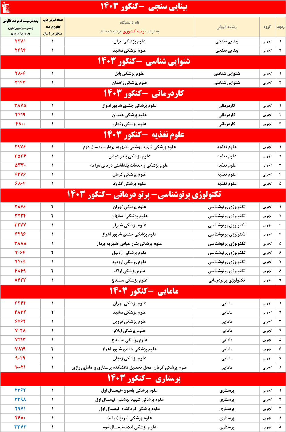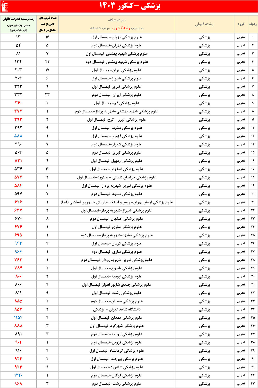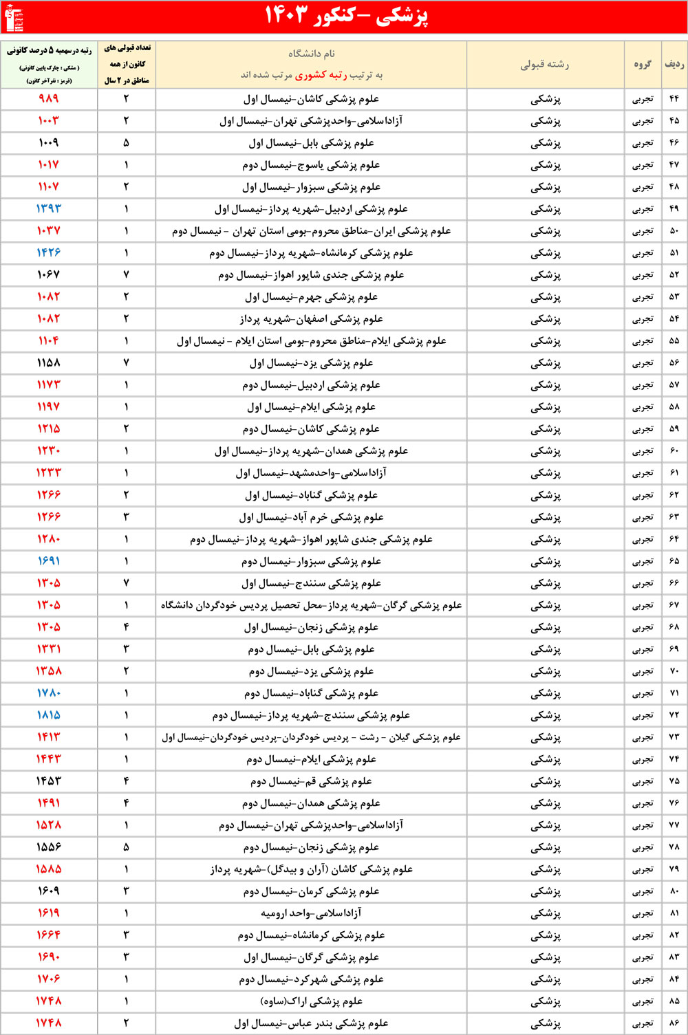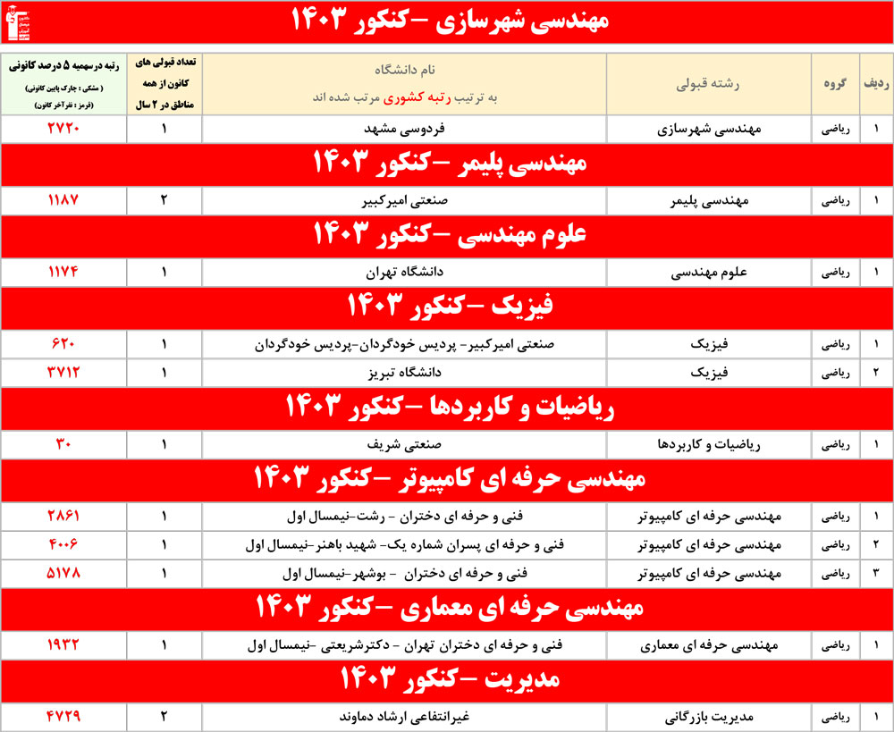 رنگ قرمز: مربوط به قبولی های کمتر از 3 نفر است