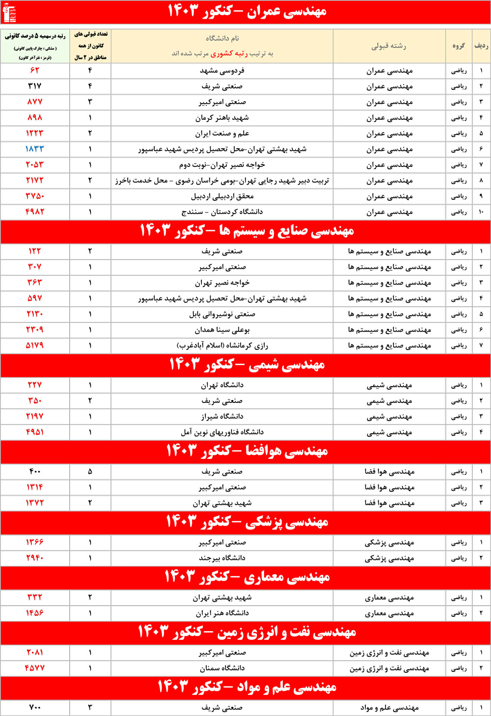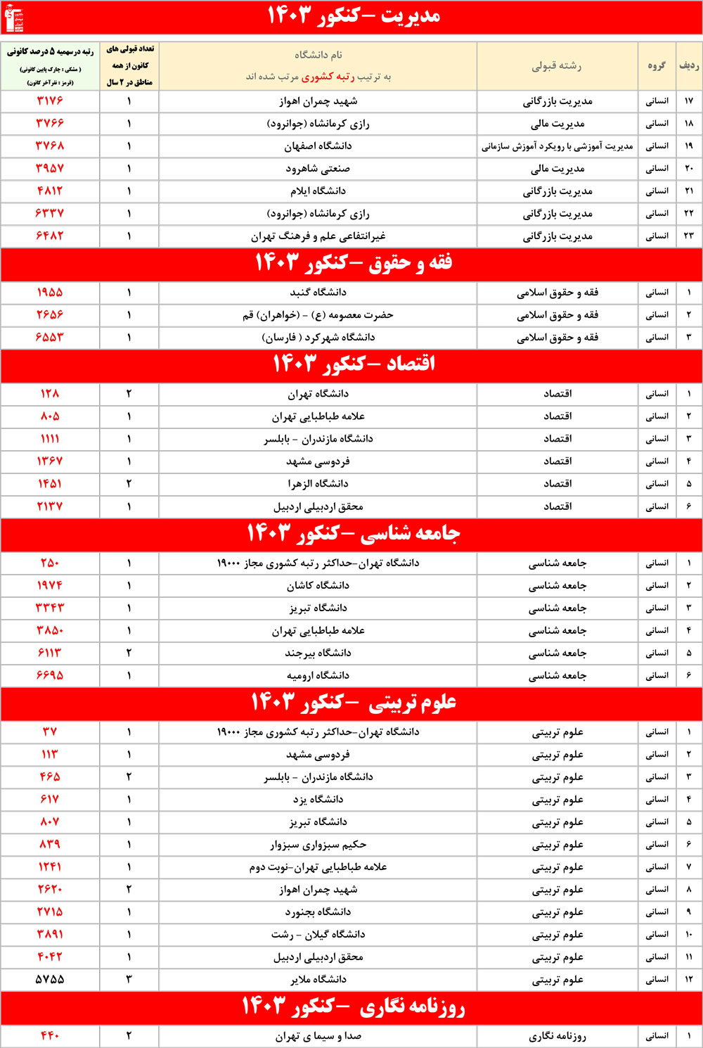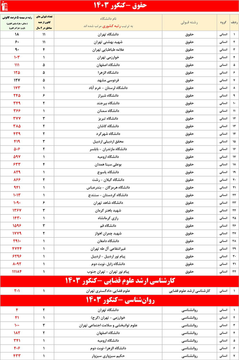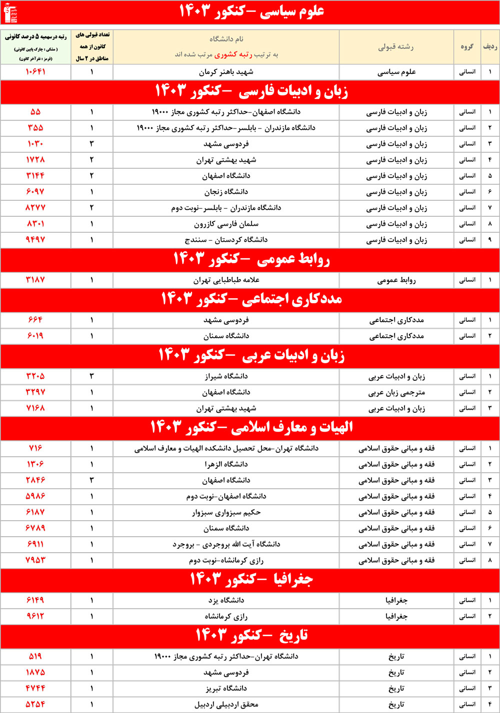 رنگ قرمز: مربوط به قبولی های کمتر از 3 نفر است