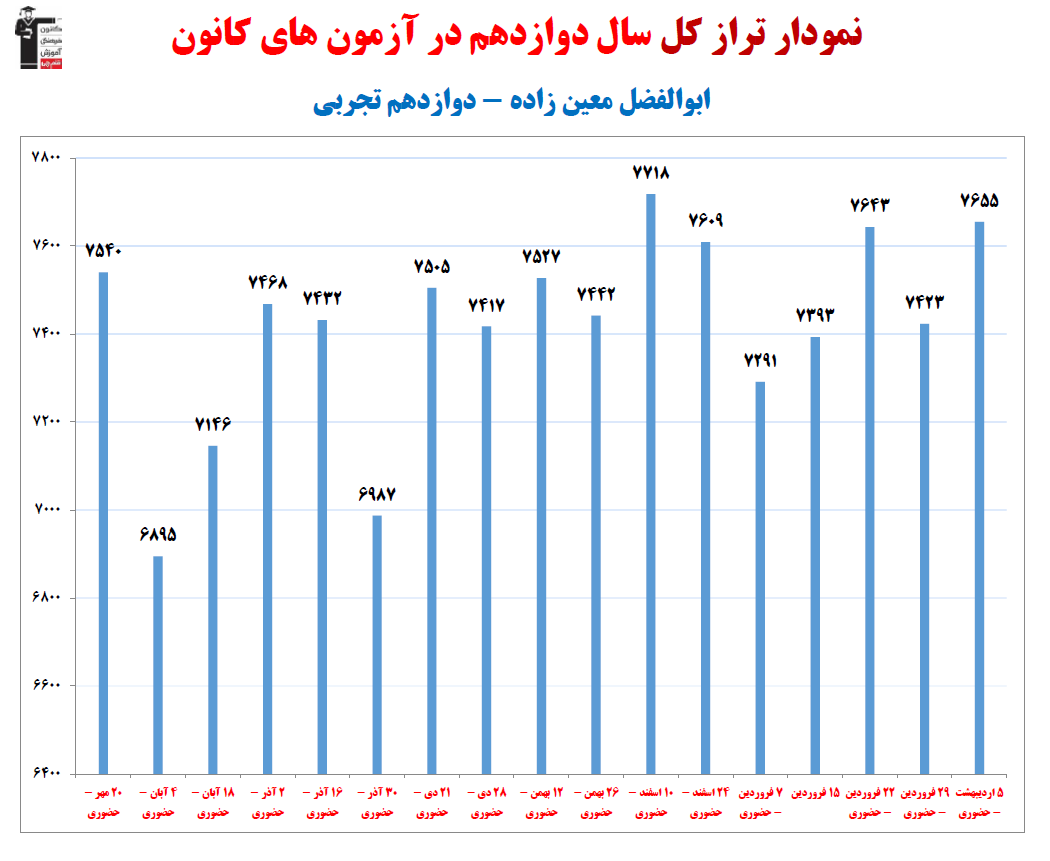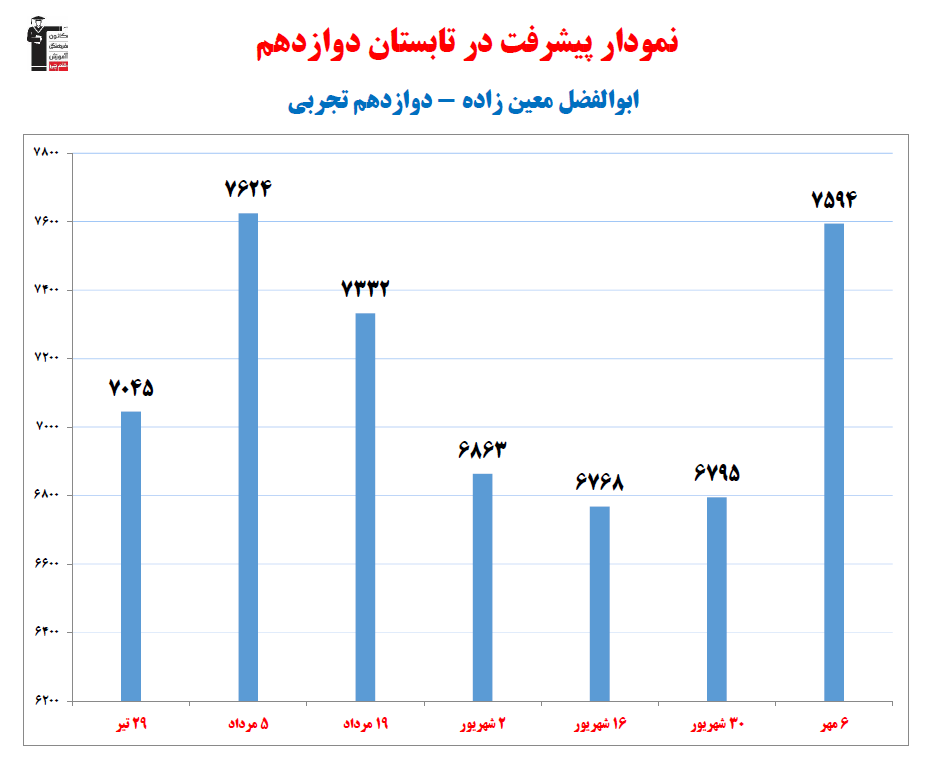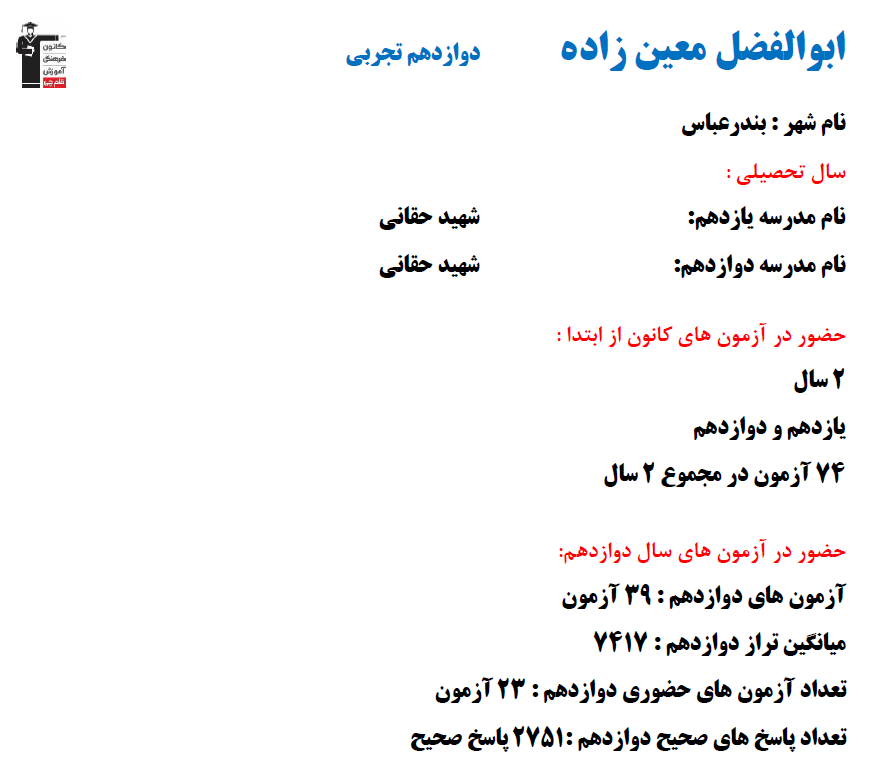 در ادامه میتوانید عملکرد درسی ابوالفضل معين زاده را در کانون مشاهده کنید.نمودار پیشرفت میانگین تراز در پایههای مختلف، نمودار تراز کل، عملکرد آزمونهای سال دوازدهم و شروع از تابستان و تراز آزمون های تابستان، کارنامههای مبحثی در نمودارها و تصاویر زیر قابل مشاهده است.