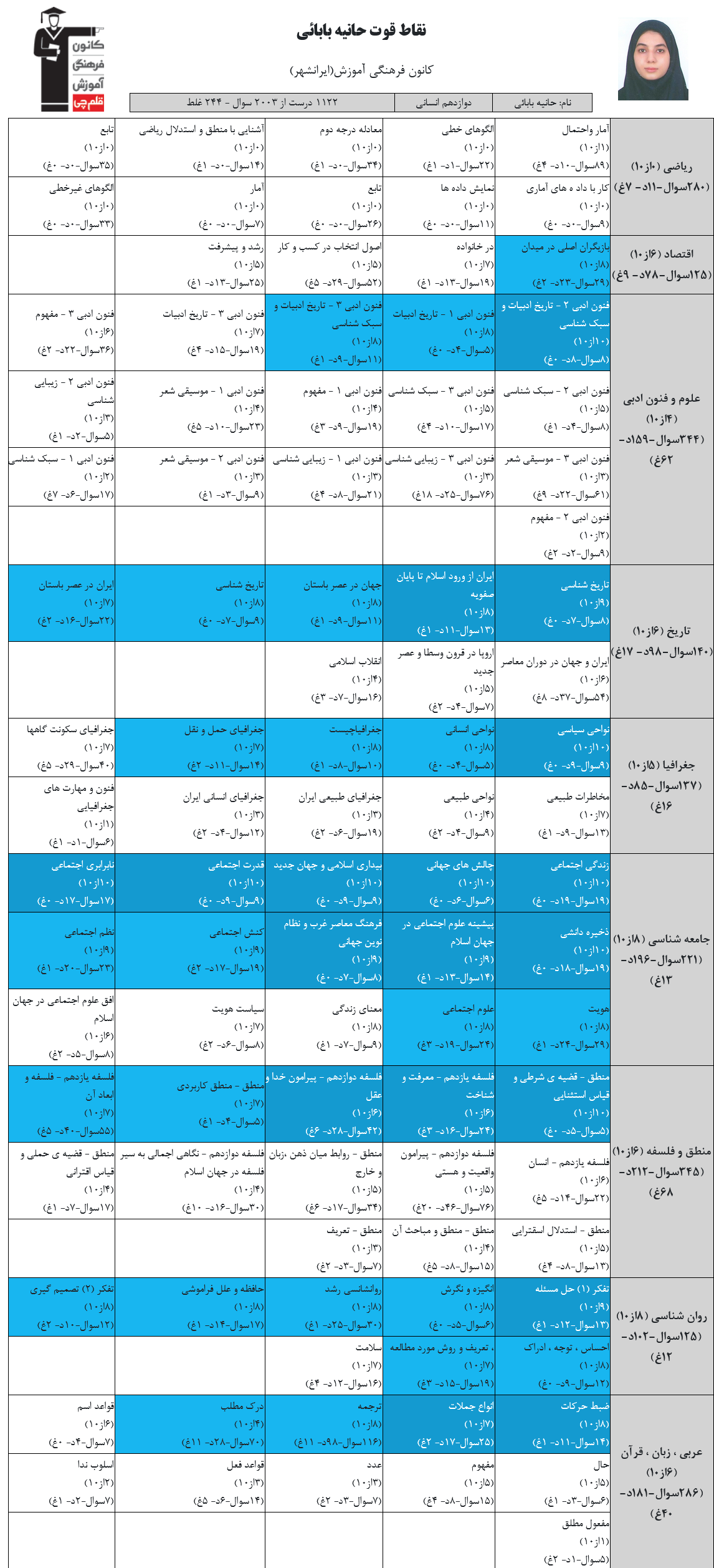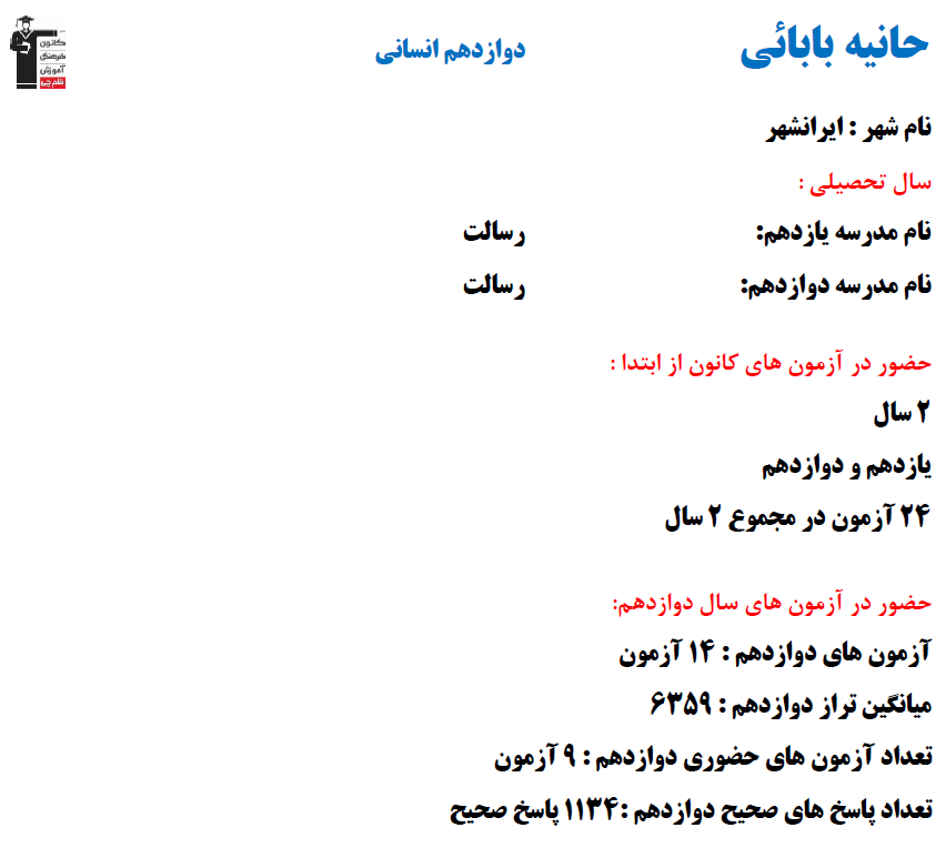 در ادامه میتوانید عملکرد درسی حانيه بابائي را در کانون مشاهده کنید.نمودار پیشرفت میانگین تراز در پایههای مختلف، نمودار تراز کل، عملکرد آزمونهای سال دوازدهم و کارنامههای مبحثی در نمودارها و تصاویر زیر قابل مشاهده است.