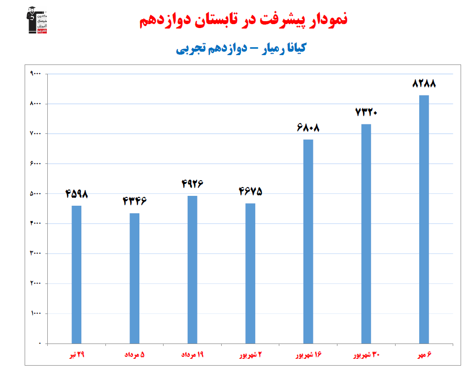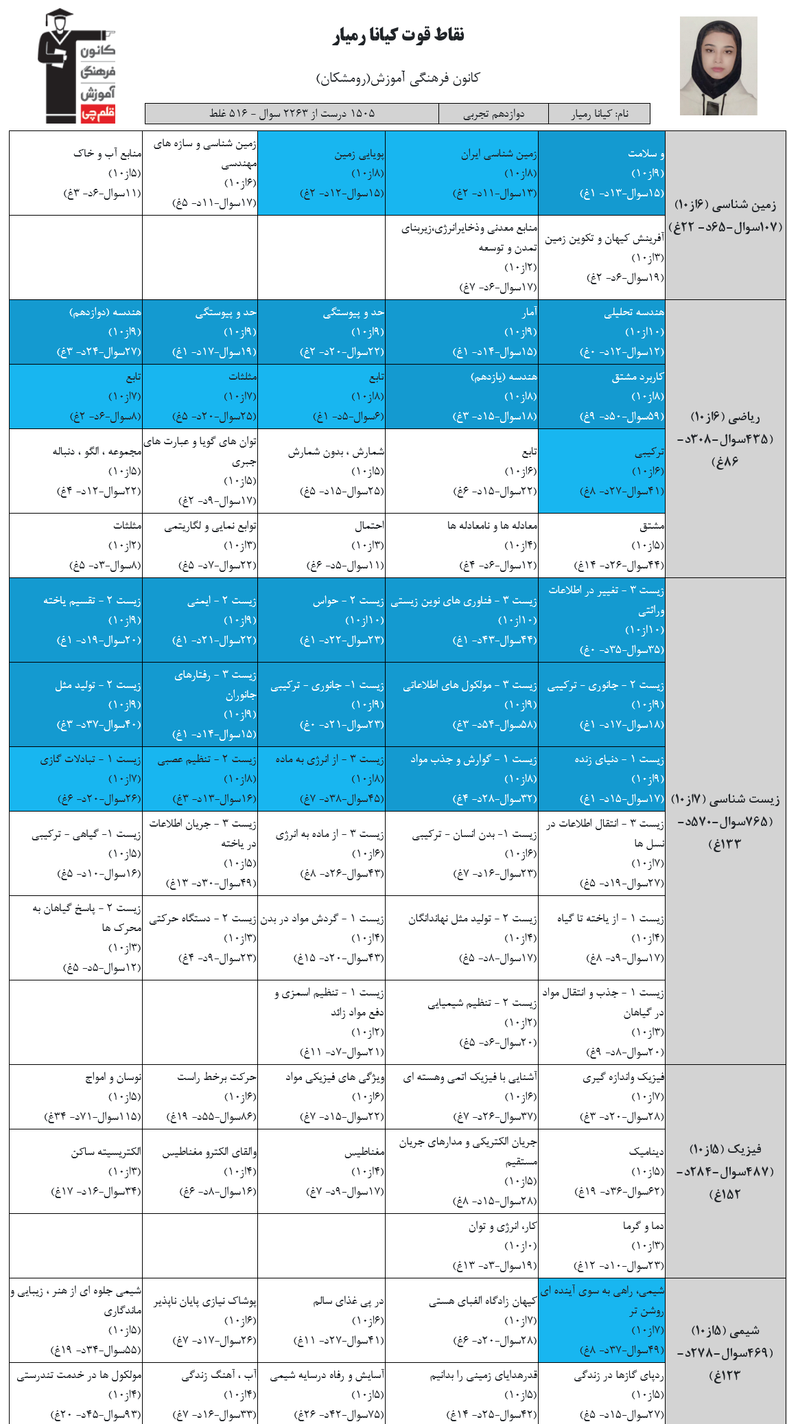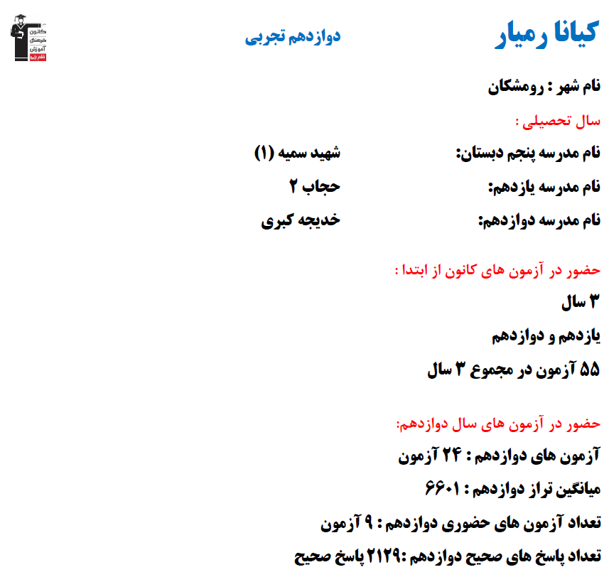 در ادامه میتوانید عملکرد درسی کيانا رميار را در کانون مشاهده کنید.نمودار پیشرفت میانگین تراز در پایههای مختلف، نمودار تراز کل، عملکرد آزمونهای سال دوازدهم و شروع از تابستان و تراز آزمون های تابستان، کارنامههای مبحثی در نمودارها و تصاویر زیر قابل مشاهده است.