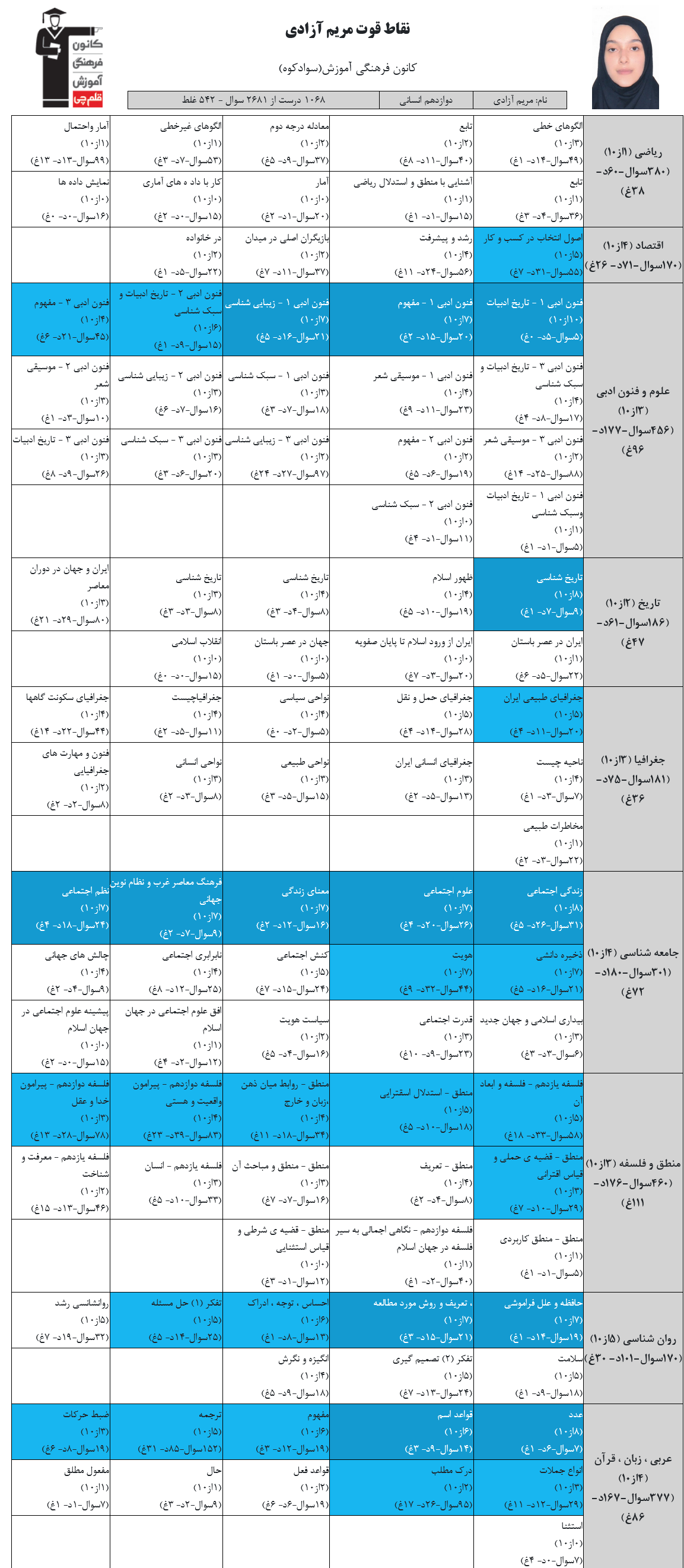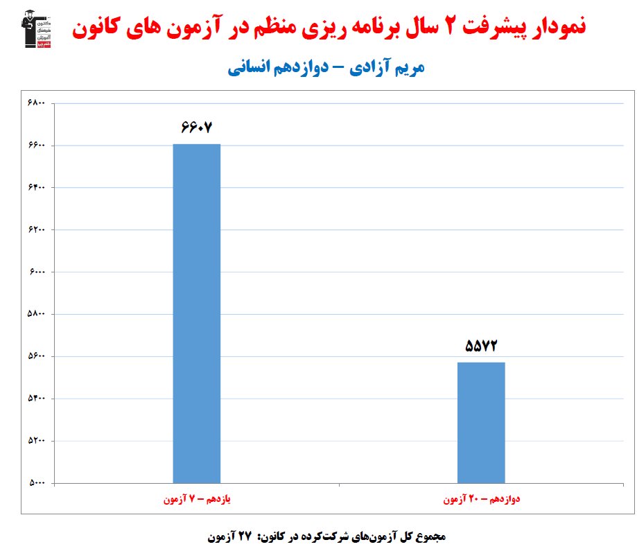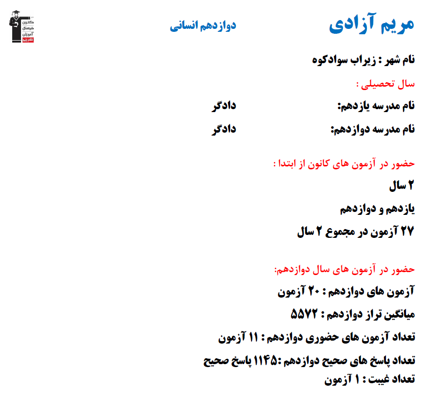 در ادامه میتوانید عملکرد درسی مريم آزادي را در کانون مشاهده کنید.عملکرد آزمونهای سال دوازدهم و شروع از تابستان و تراز آزمون های تابستان، کارنامههای مبحثی در نمودارها و تصاویر زیر قابل مشاهده است.