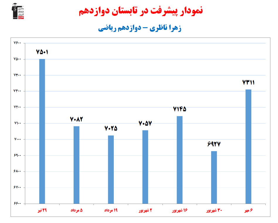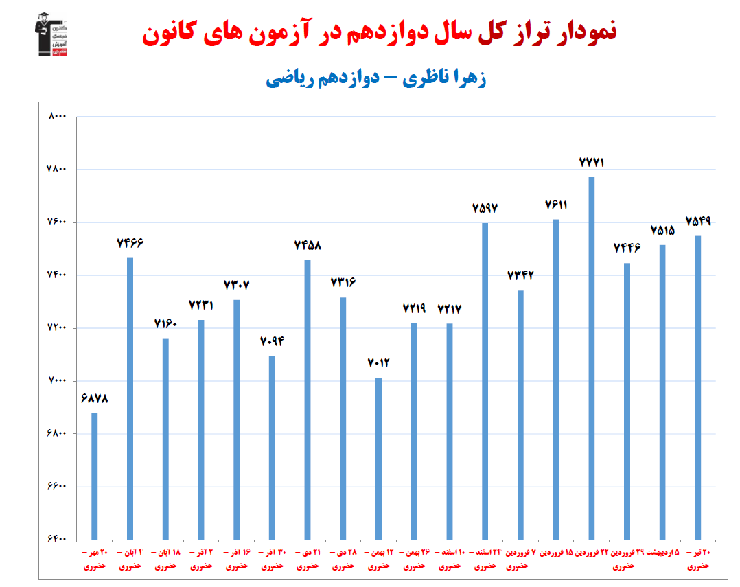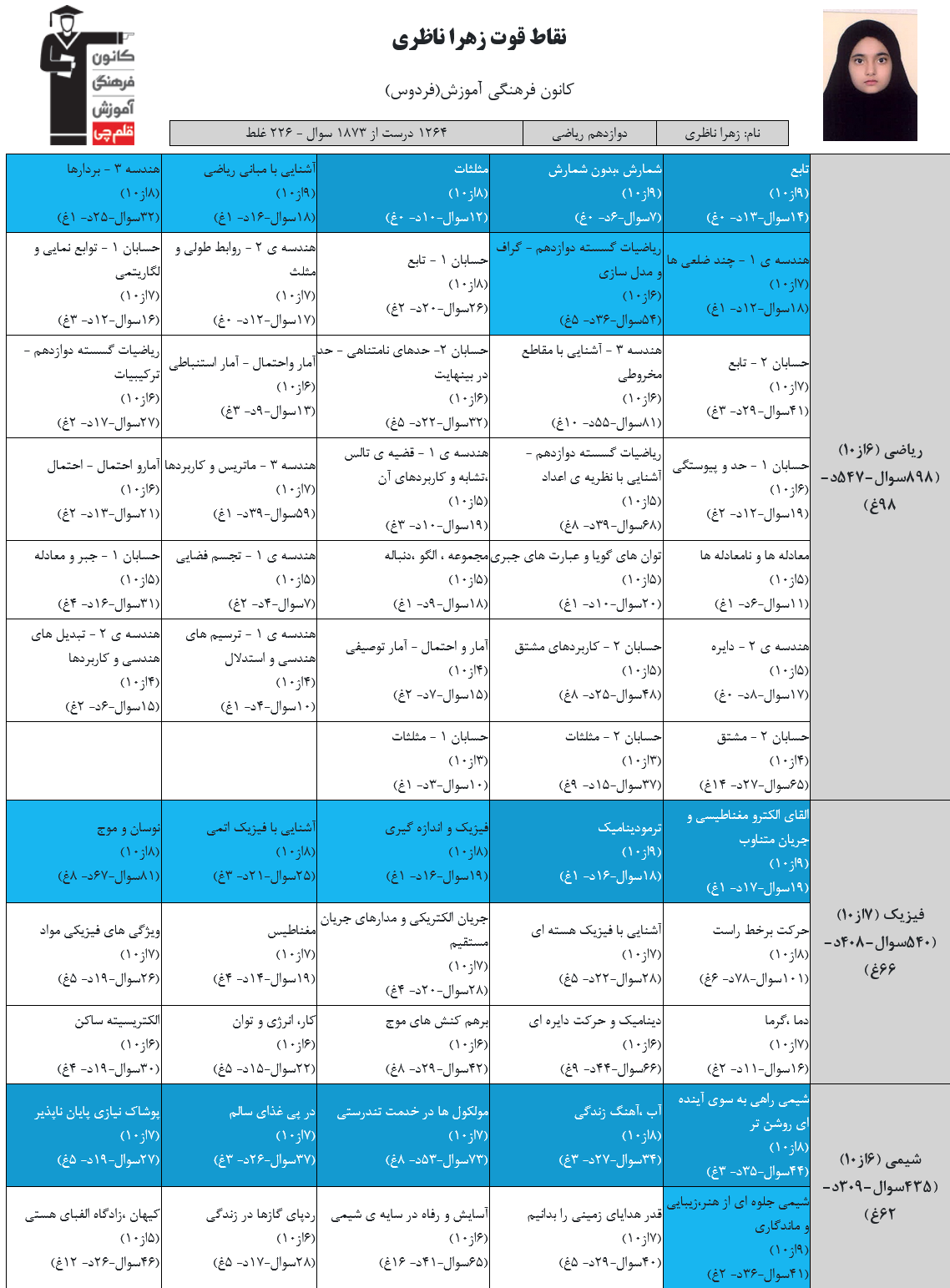 در ادامه میتوانید عملکرد درسی زهرا ناظري را در کانون مشاهده کنید.نمودار پیشرفت میانگین تراز در پایههای مختلف، نمودار تراز کل، عملکرد آزمونهای سال دوازدهم و شروع از تابستان و تراز آزمون های تابستان، کارنامههای مبحثی در نمودارها و تصاویر زیر قابل مشاهده است.