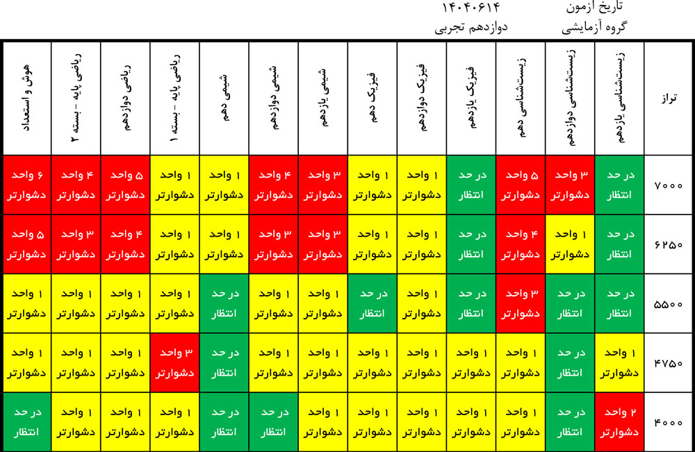 در این جدول برای هر درس رنگ های متفاوتی را می بینید .ممکن است یک درس برای یک بازه ی تراز دشوار و برای بازه ی تراز دیگر متعادل یا ساده باشد . ابتدا نمره ی تراز خود را در نظر بگیرید و سپس رنگ های هر درس را در بازه ی تراز خود ببینید . متوجه می شوید که آیا آن درس برای شما ساده تر از حد انتظار یا دشوارتر بوده یا این که متعادل بوده است .