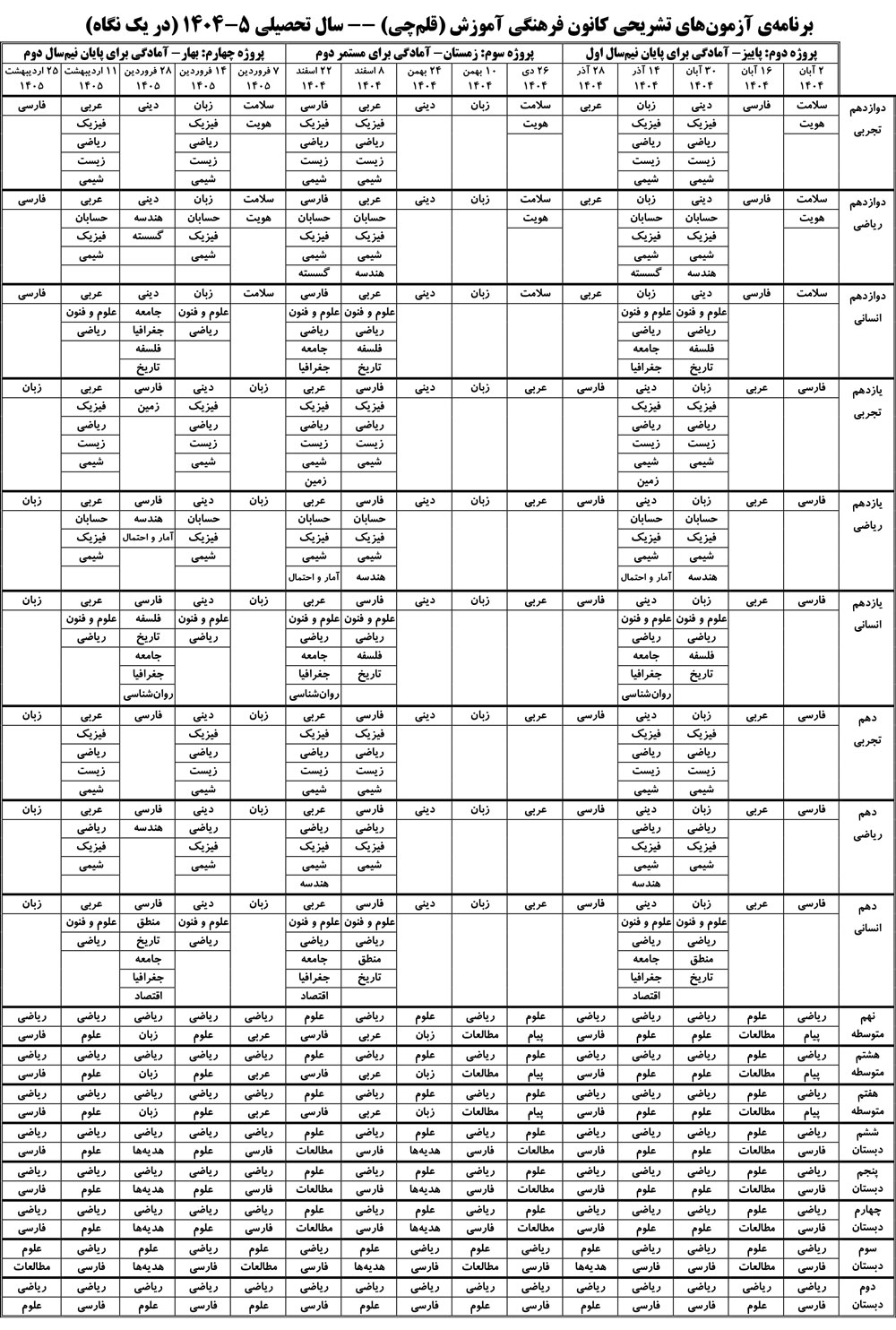 آزمون های تشریحی کانون از دوم دبستان تا دوازدهم و در سه پروژه پاییز، زمستان و بهار برگزار میگردد.