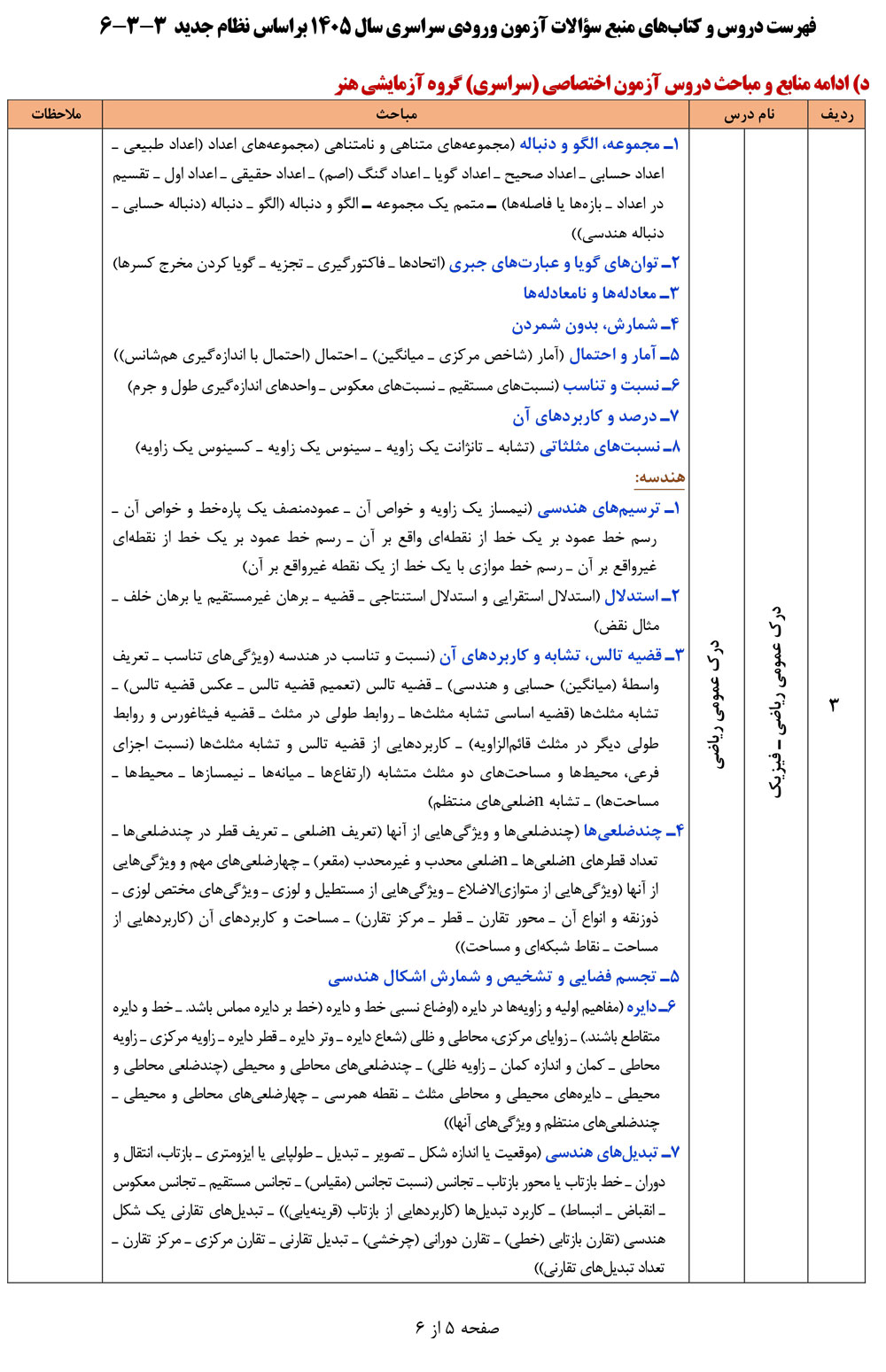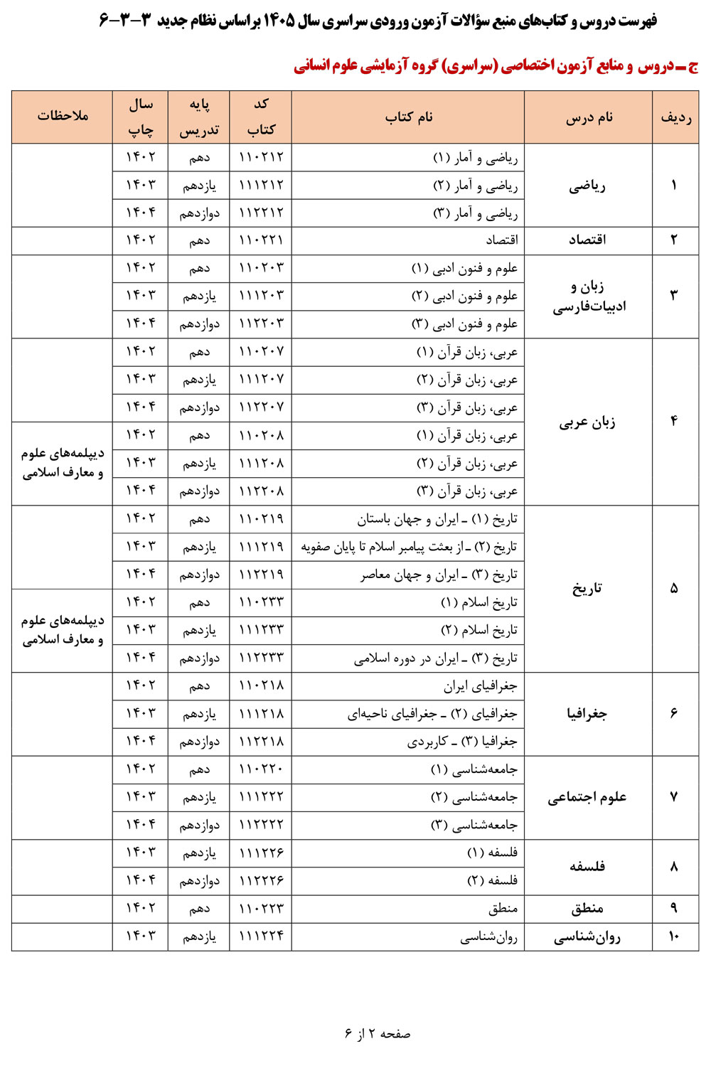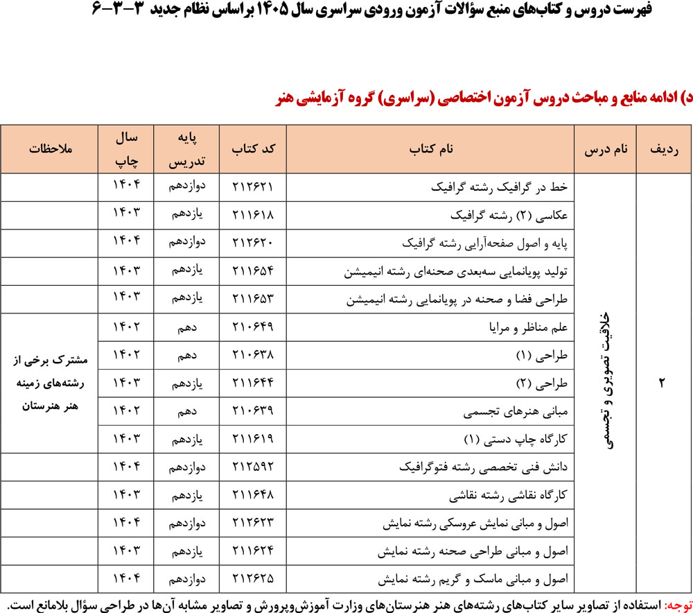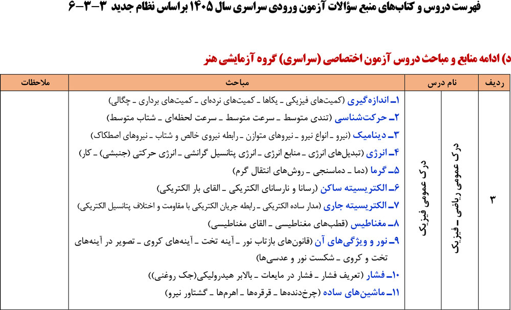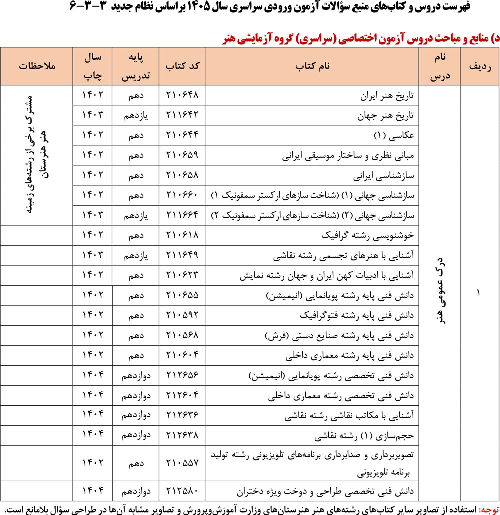 فهرست دروس و کتابهای منبع سؤالات آزمون ورودی سراسری سال ۱۴۰۵ براساس نظام جدید ۳-۳-۶ منتشر شد.