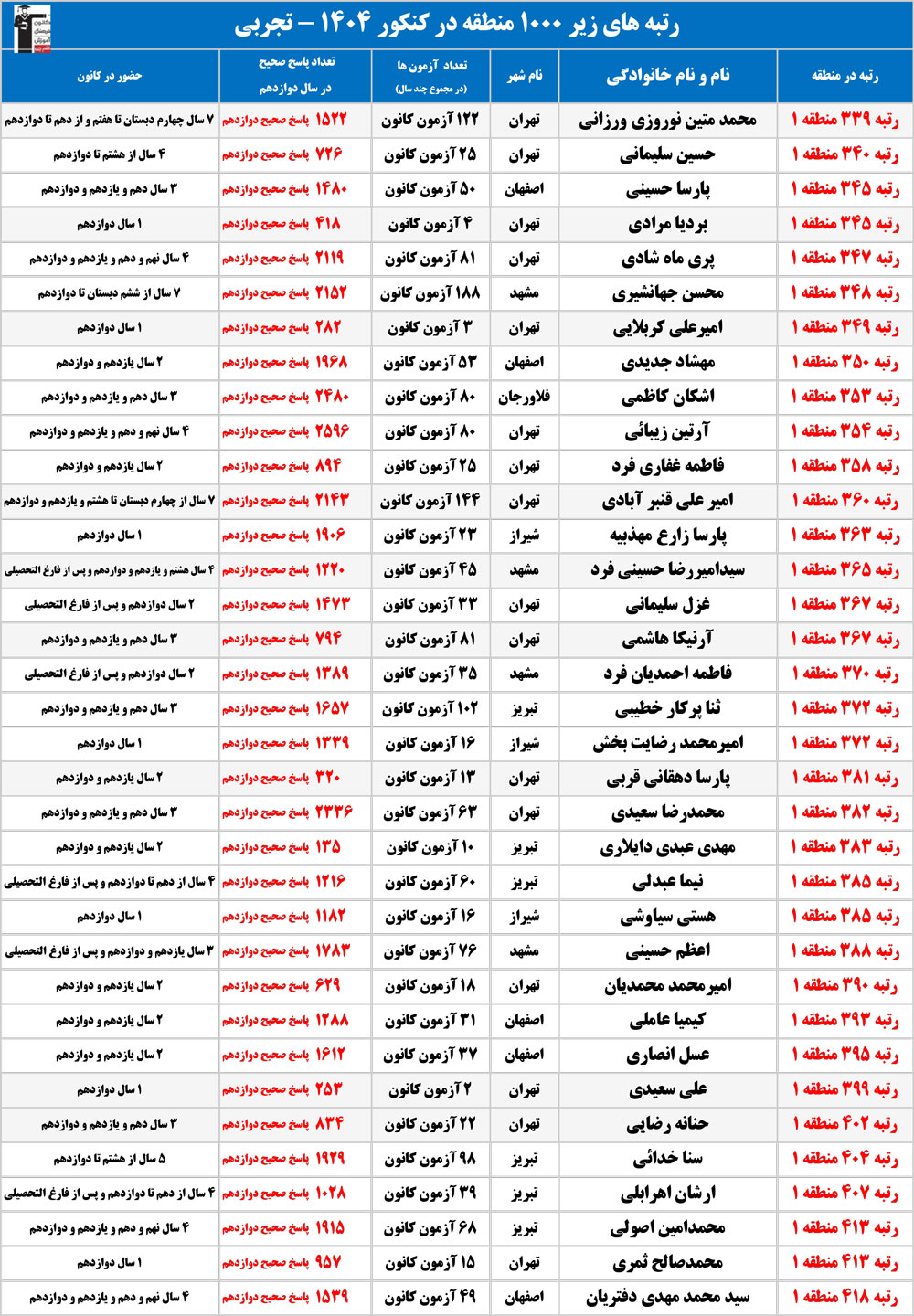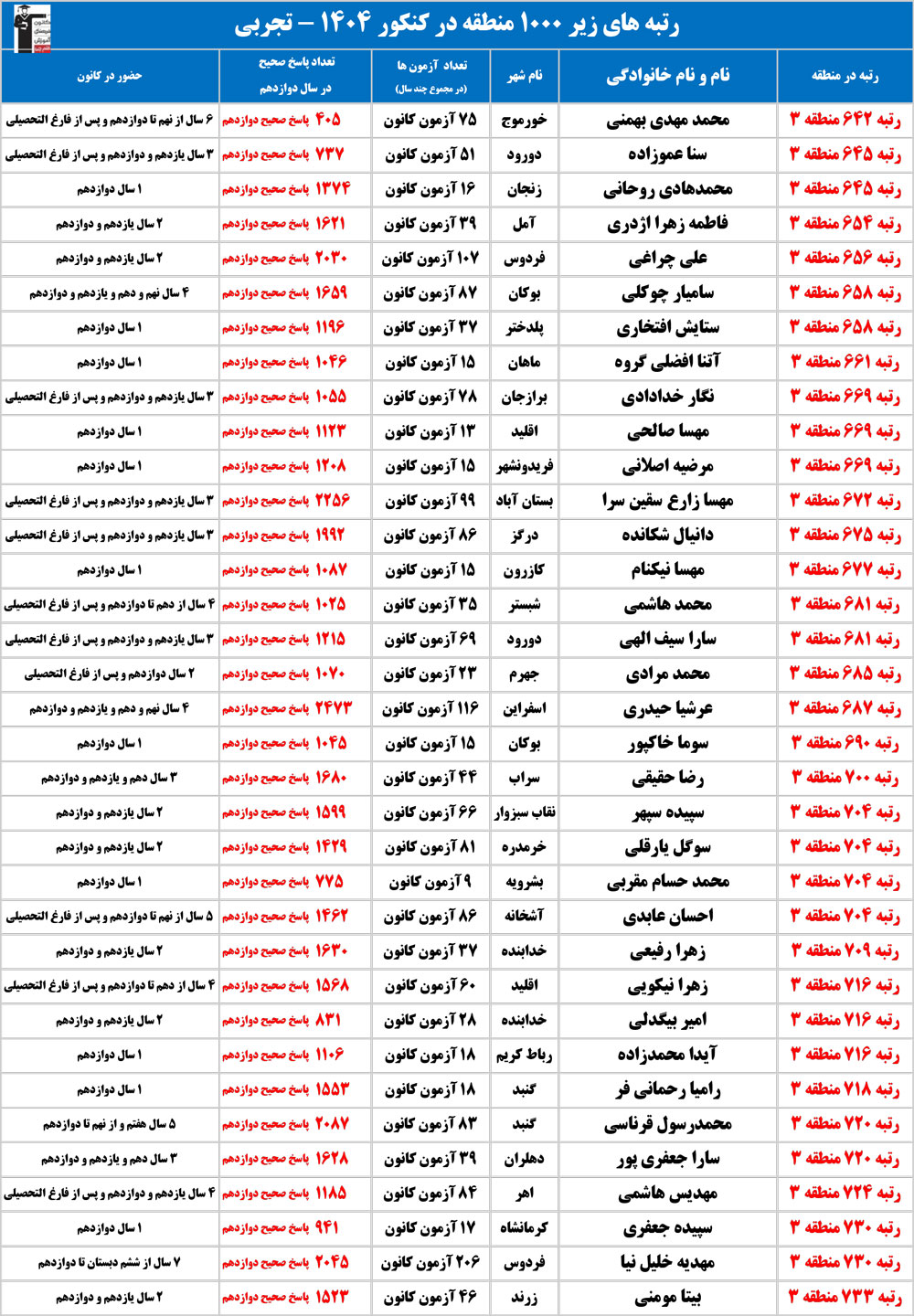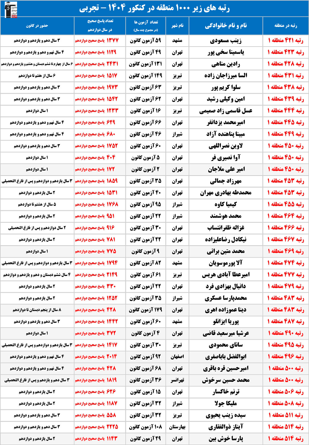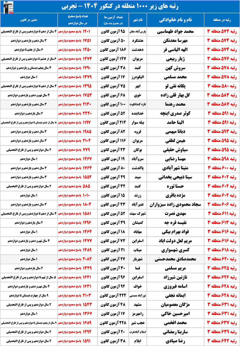 در ادامه با رتبه های زیر 1000 منطقه کانونی در کنکور 1404 در رشته تجربی آشنا شوید.
