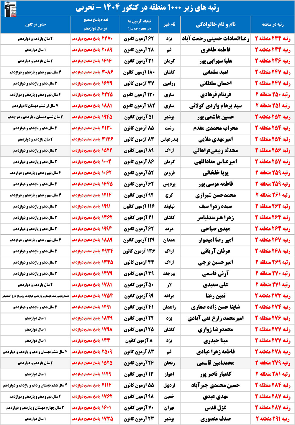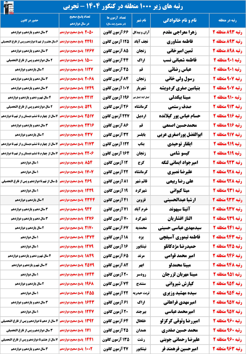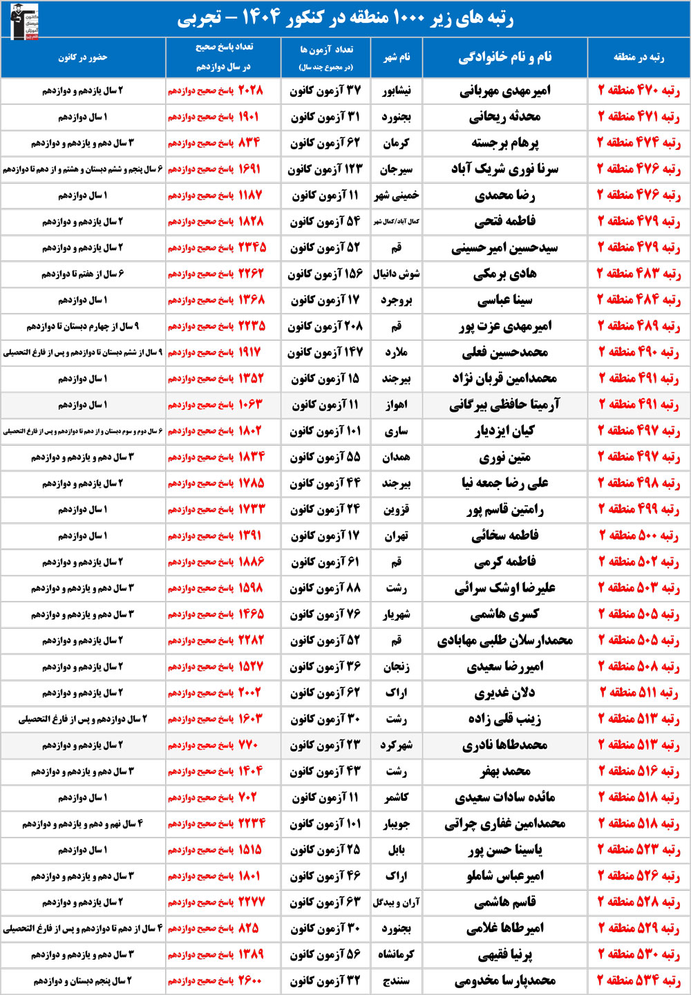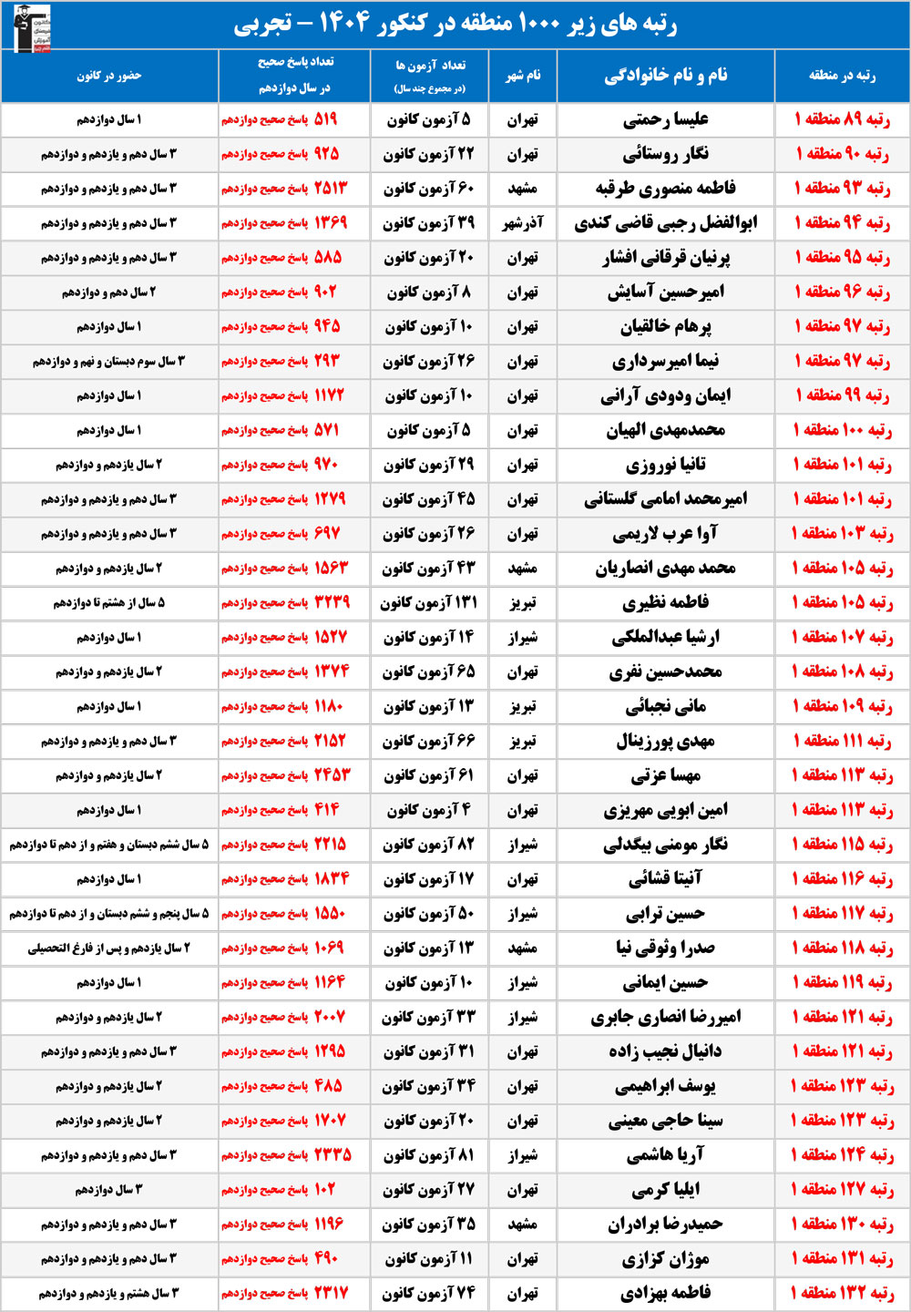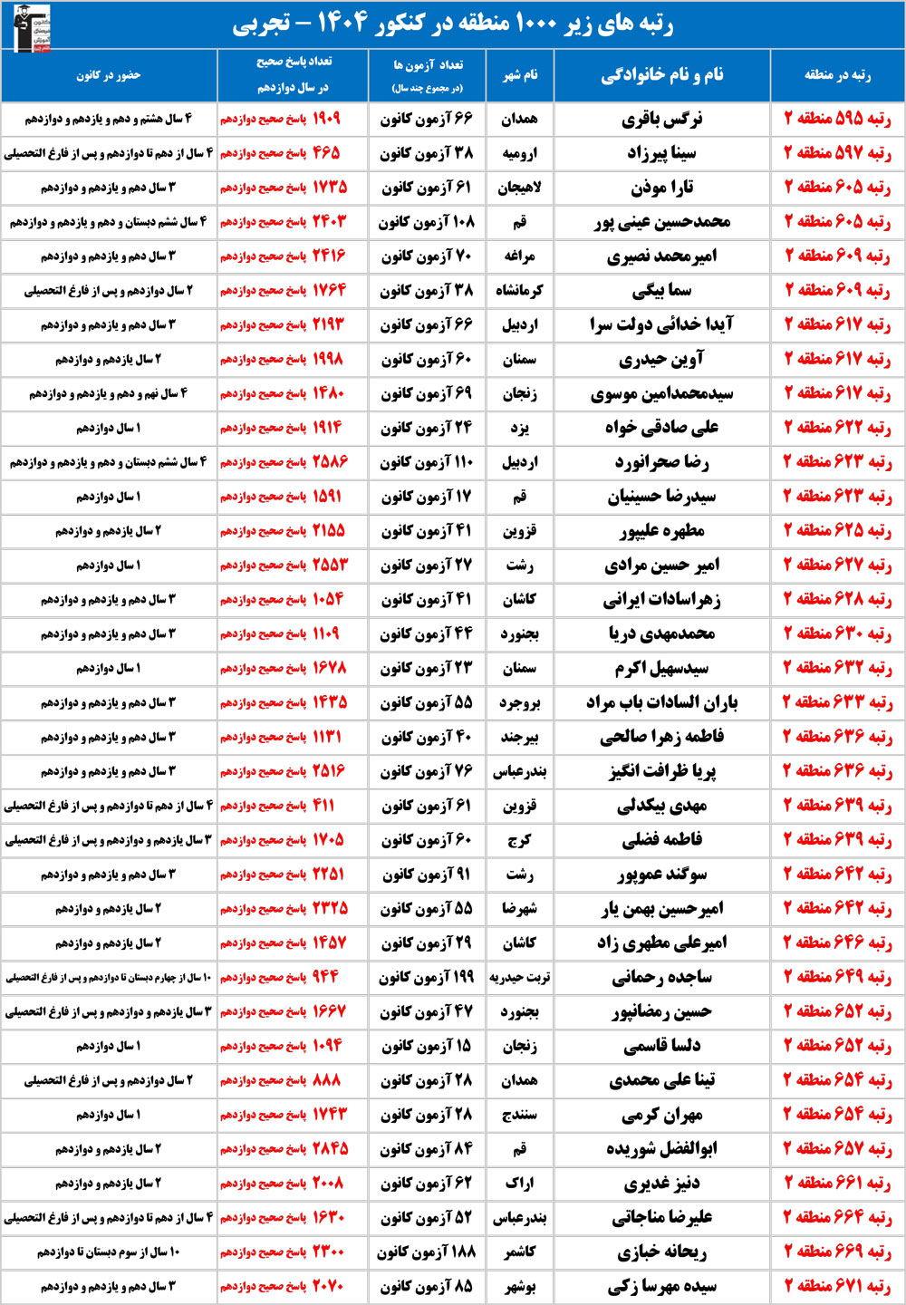 در ادامه با رتبه های زیر 1000 منطقه کانونی در کنکور 1404 در رشته تجربی آشنا شوید.
