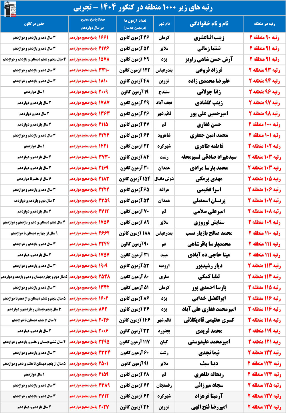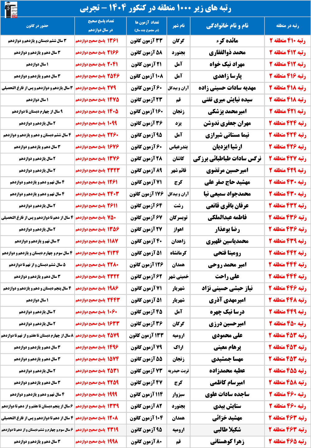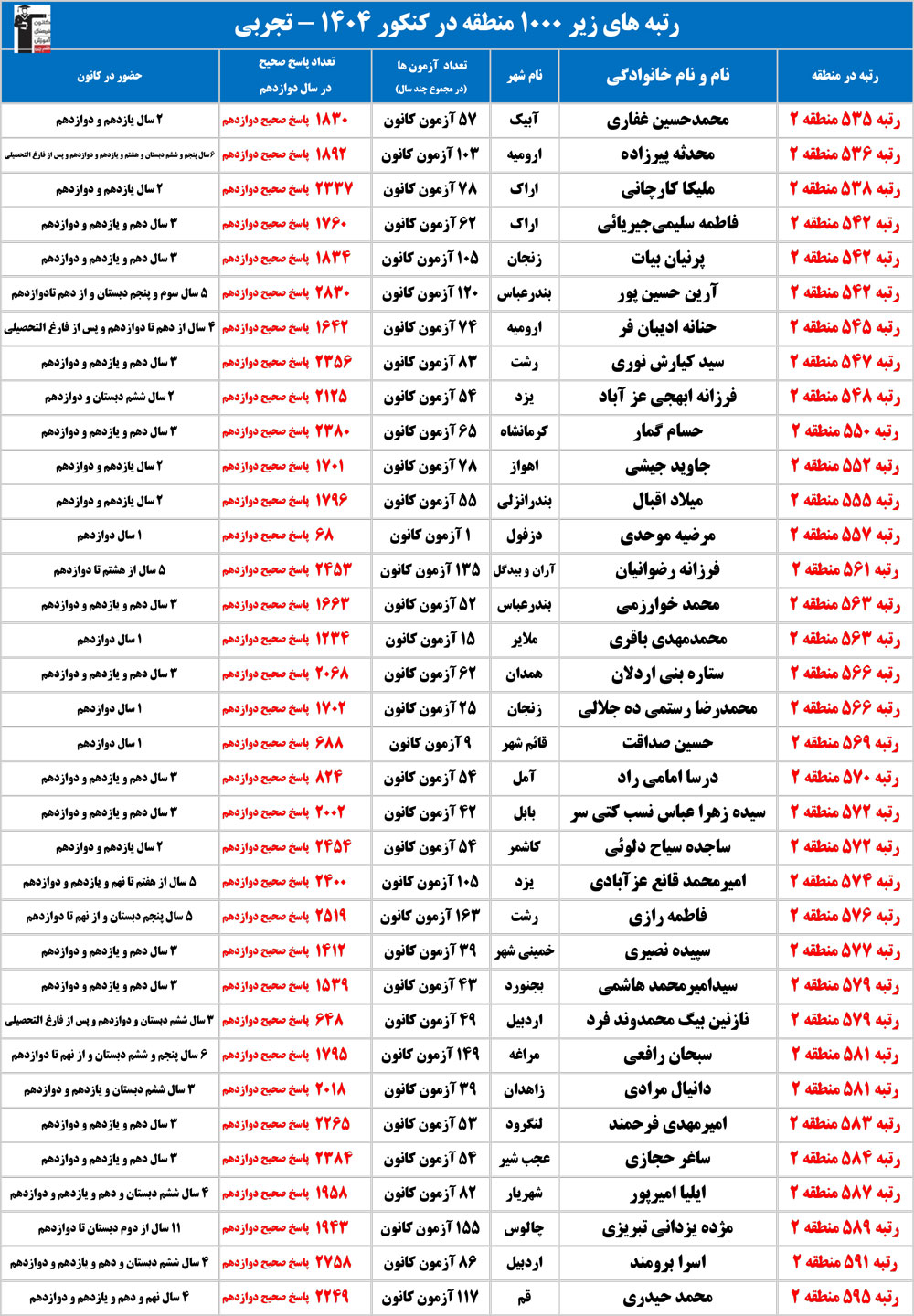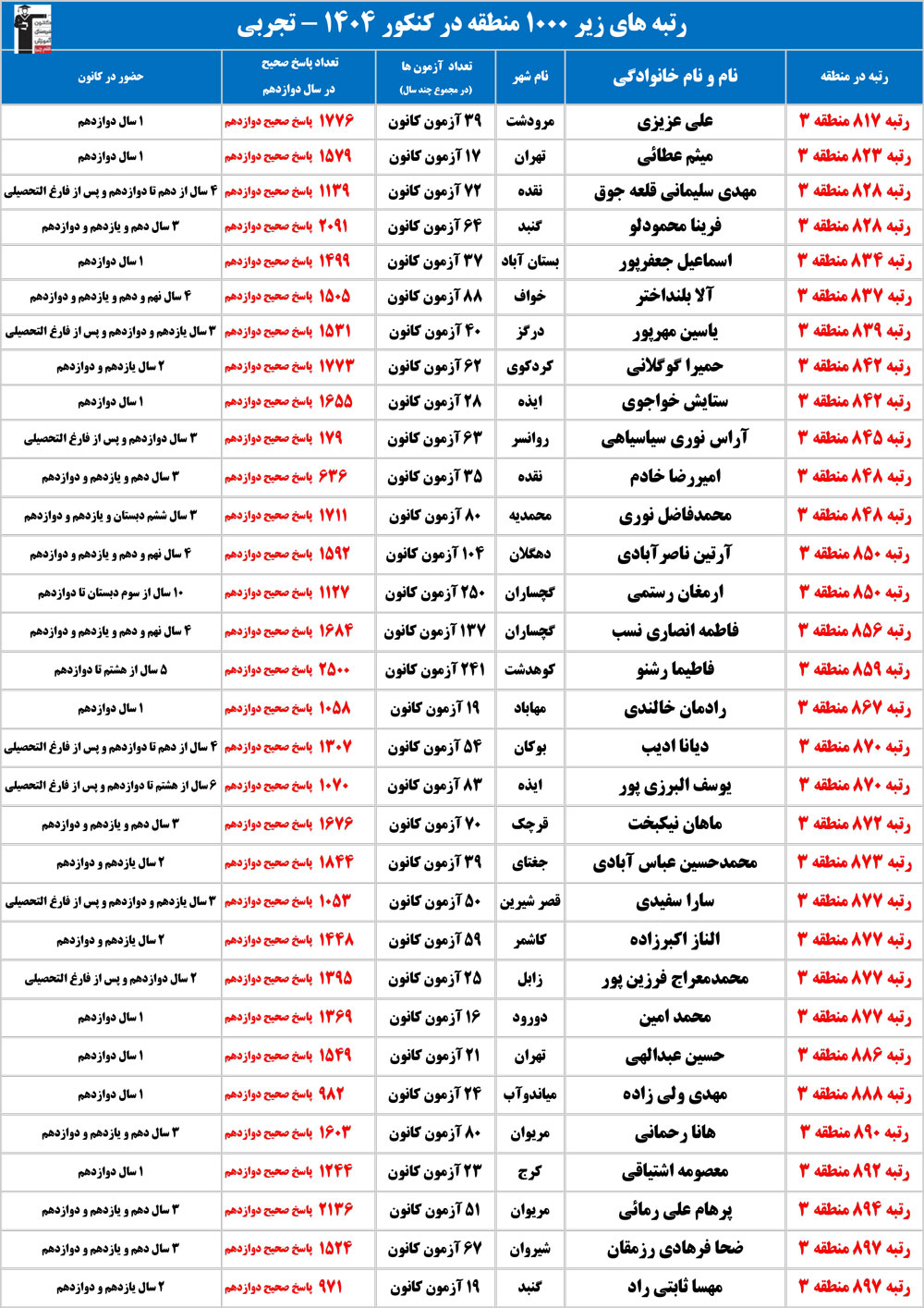 در ادامه با رتبه های زیر 1000 منطقه کانونی در کنکور 1404 در رشته تجربی آشنا شوید.