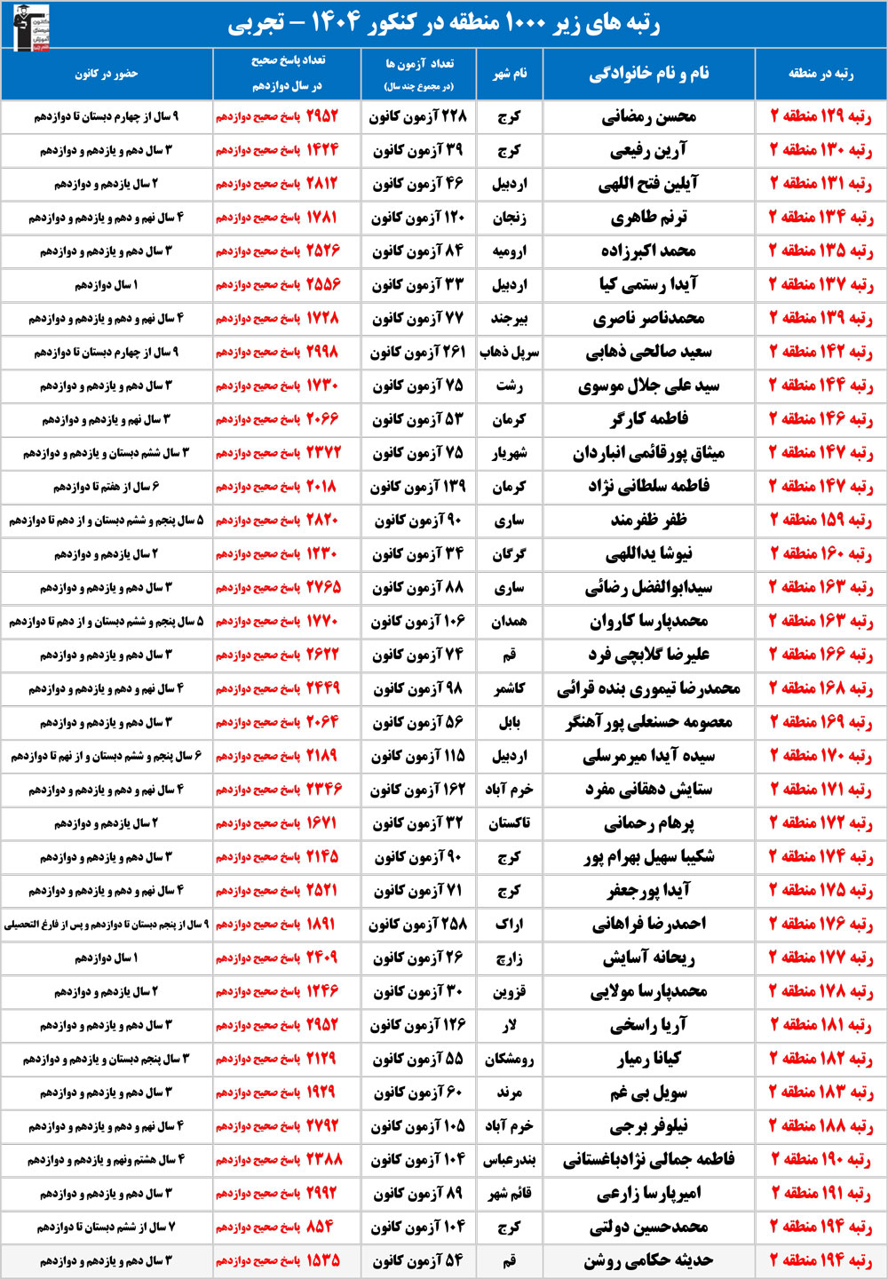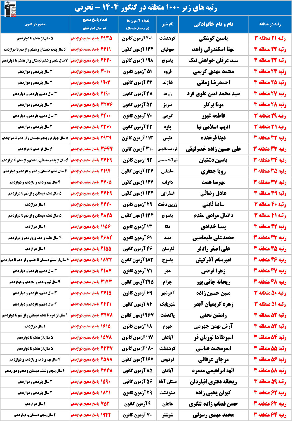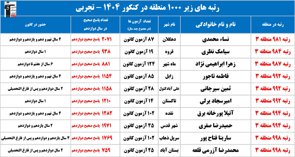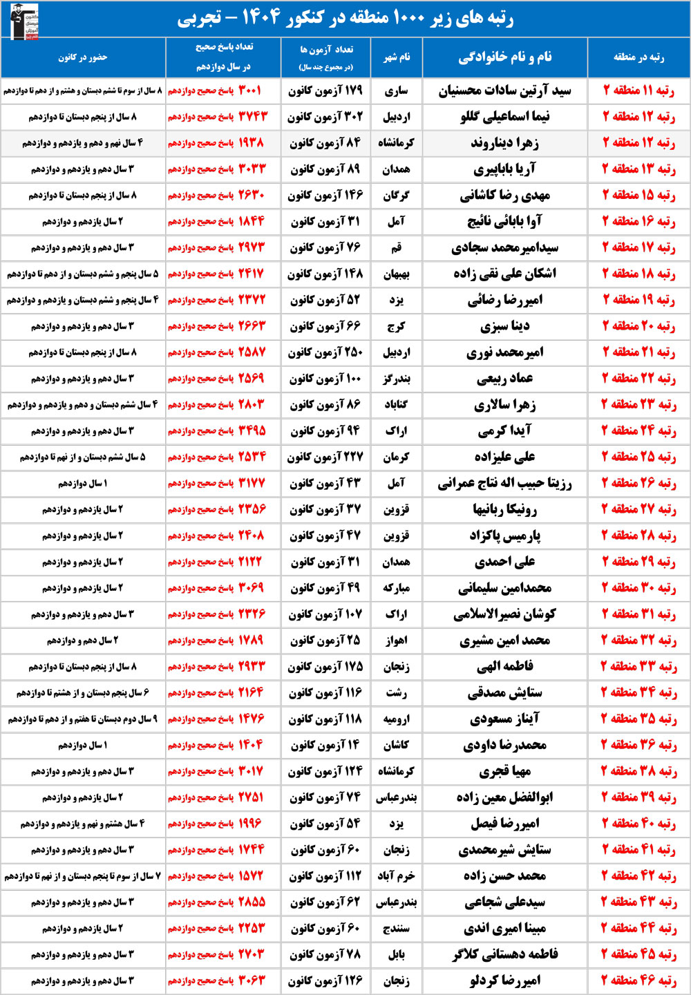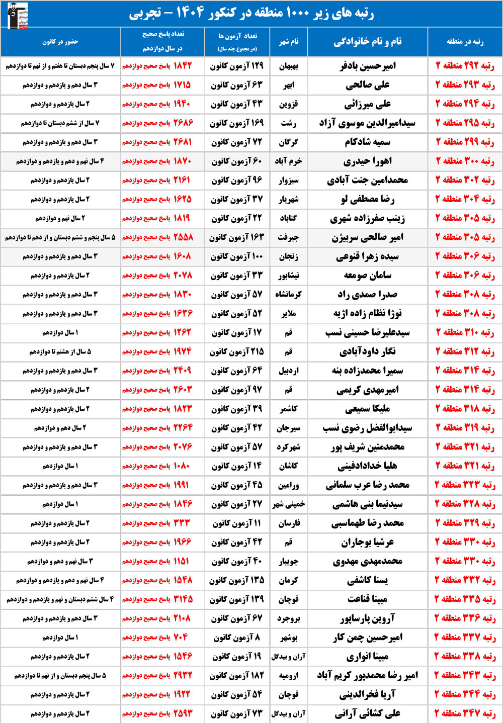 در ادامه با رتبه های زیر 1000 منطقه کانونی در کنکور 1404 در رشته تجربی آشنا شوید.