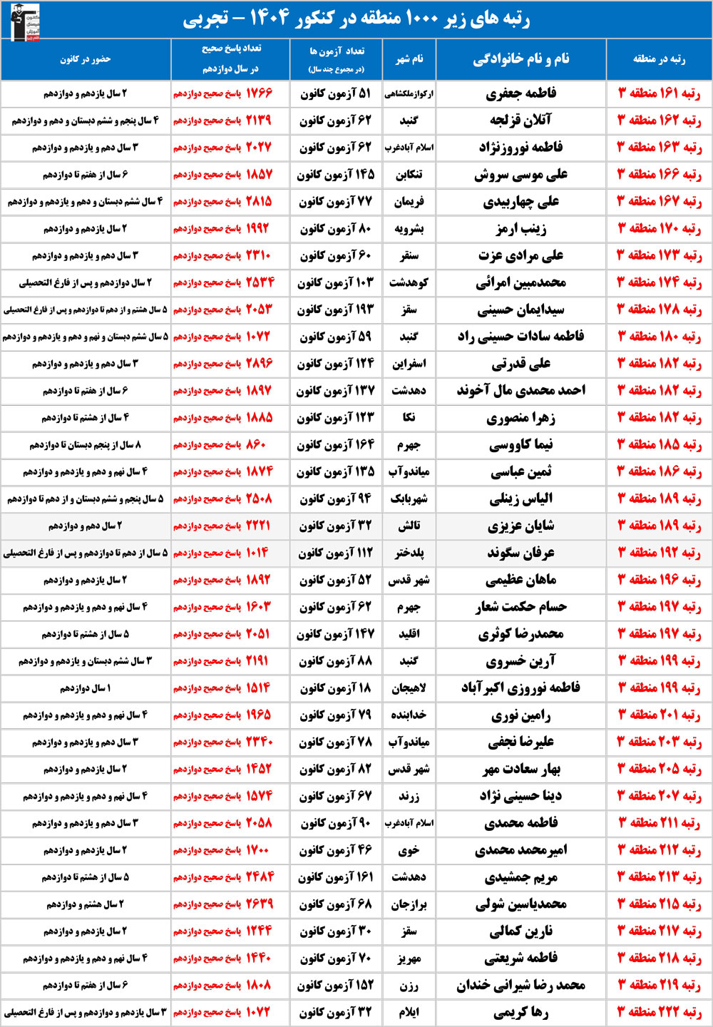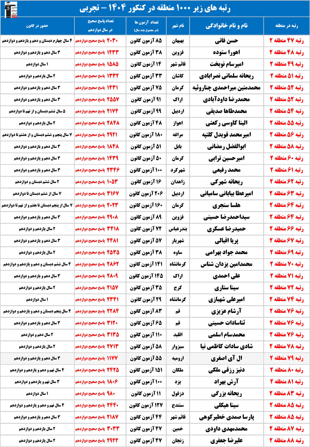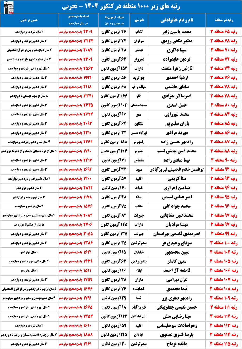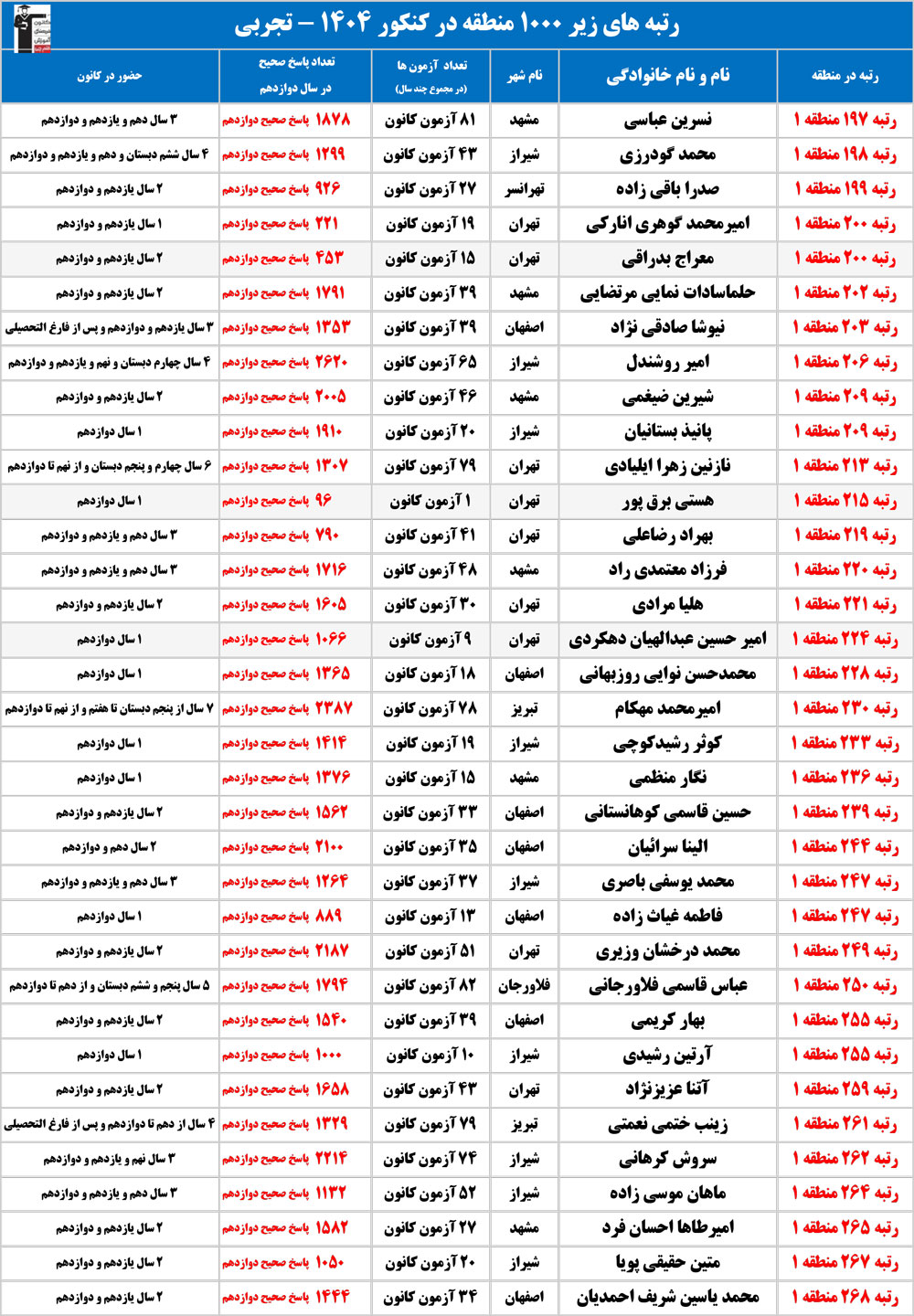 در ادامه با رتبه های زیر 1000 منطقه کانونی در کنکور 1404 در رشته تجربی آشنا شوید.