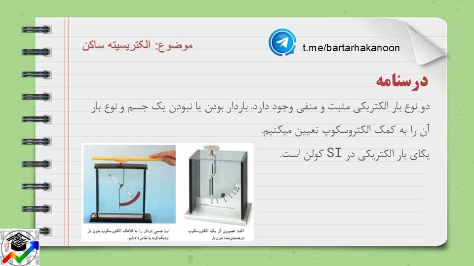 دو نوع بار الکتریکی مثبت و منفی وجود دارد. باردار بودن یا نبودن یک جسم و نوع بار آن را به کمک الکتروسکوپ تعیین میکنیم.