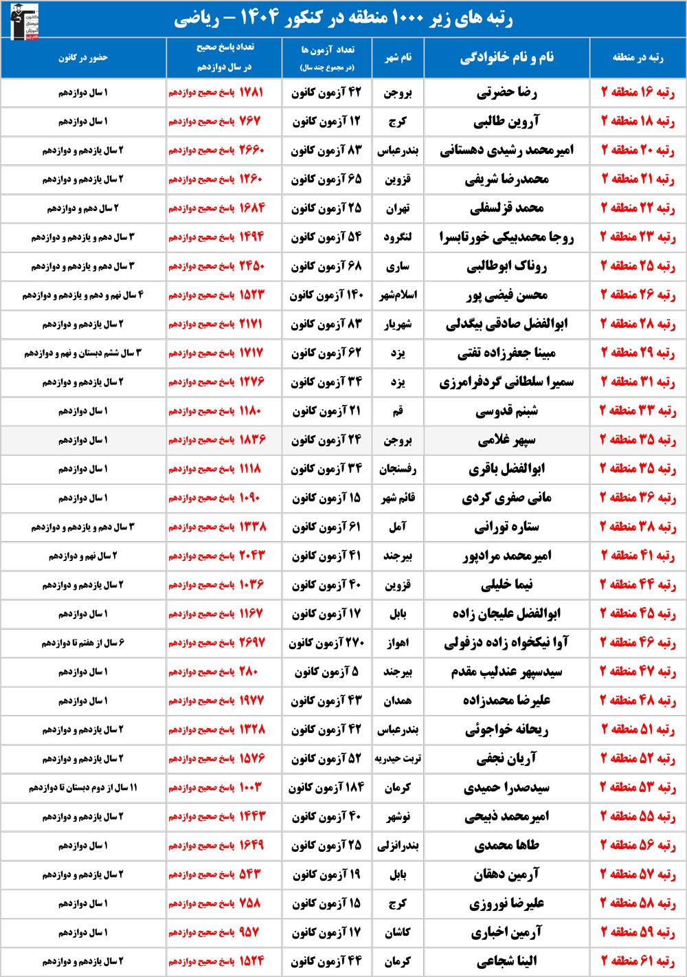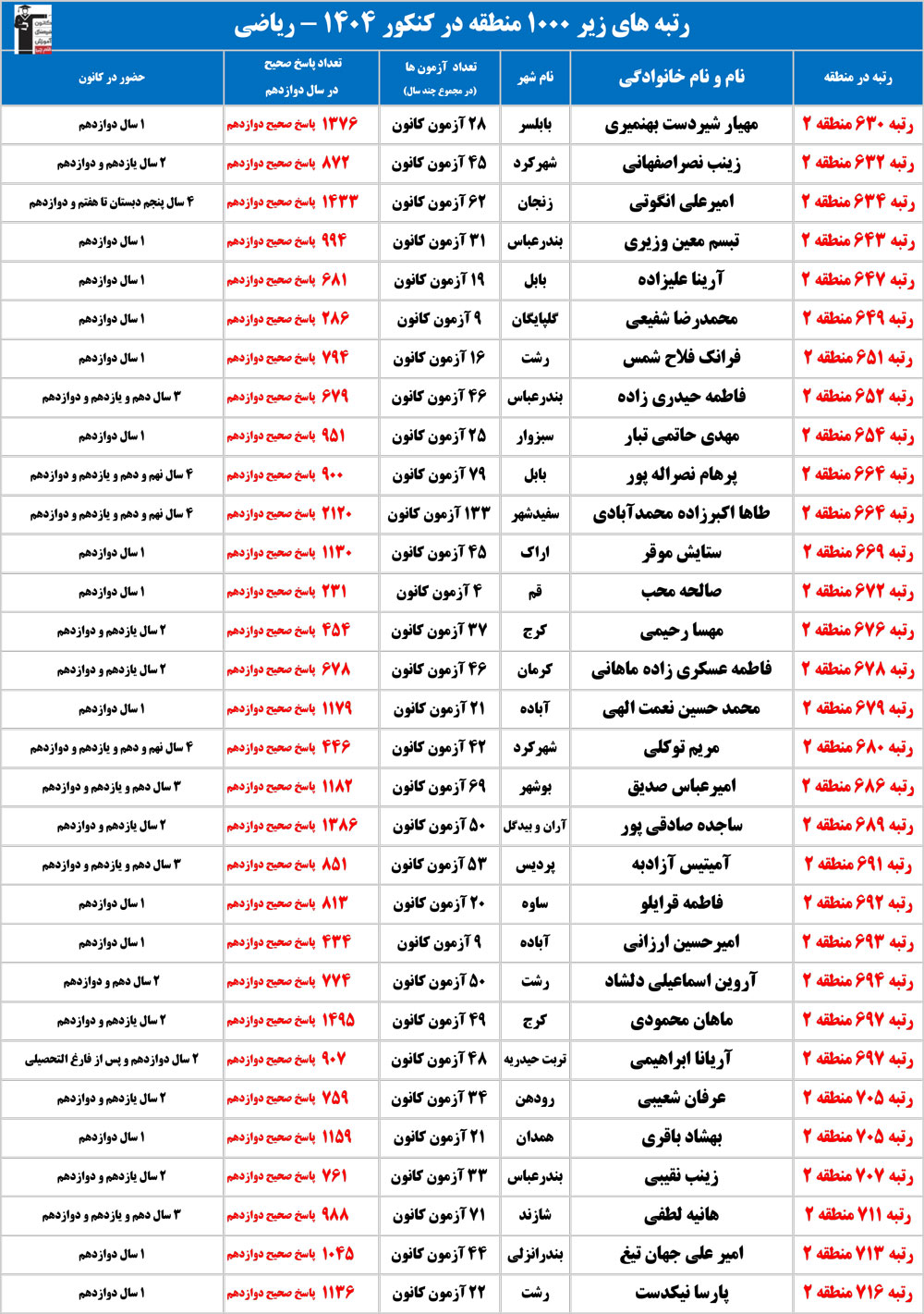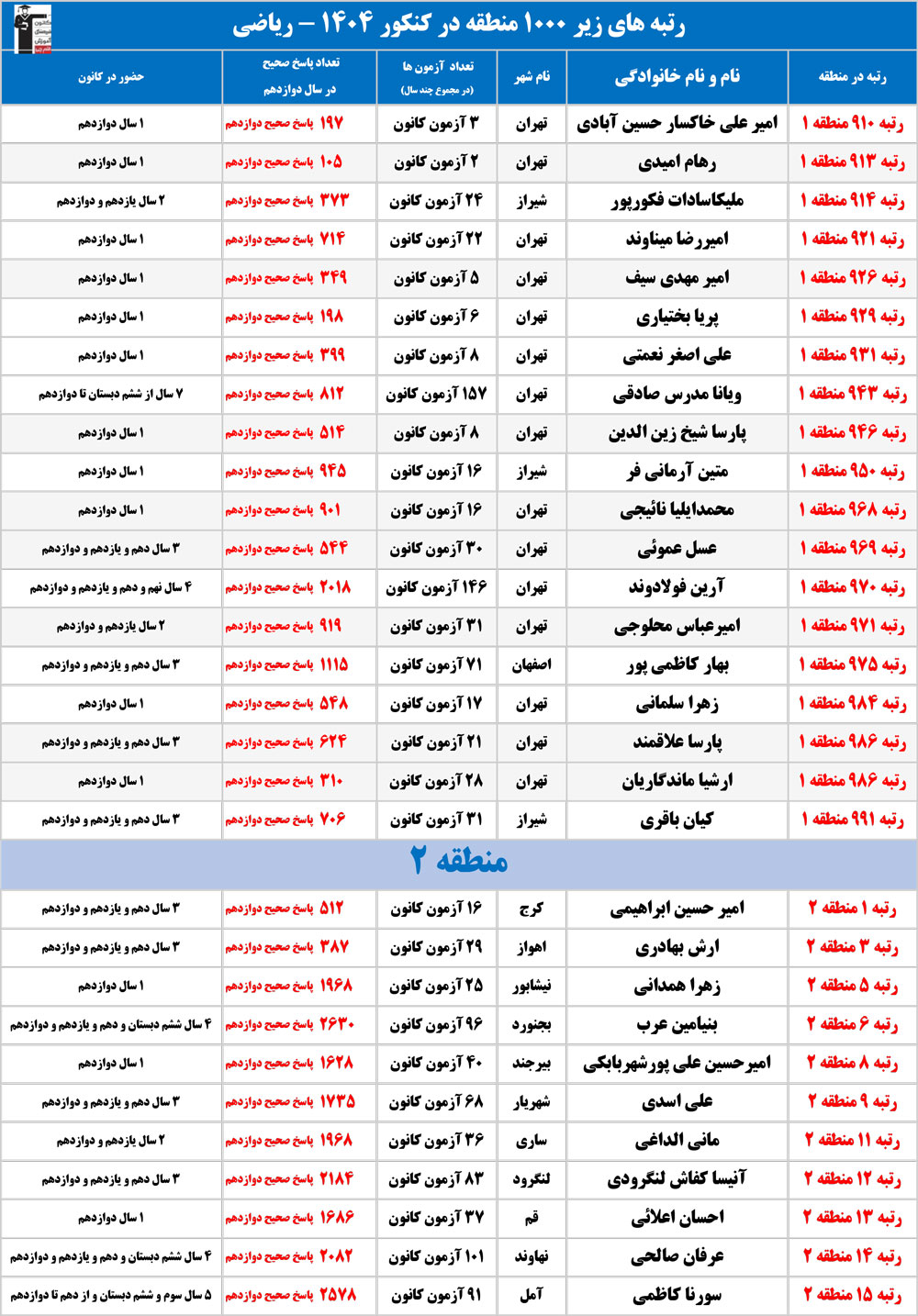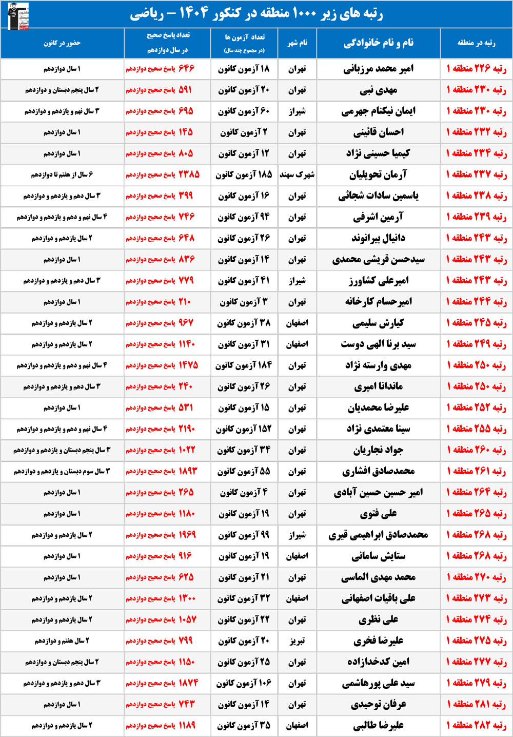 در ادامه با رتبه های زیر 1000 منطقه کانونی در کنکور 1404 در رشته ریاضی آشنا شوید.