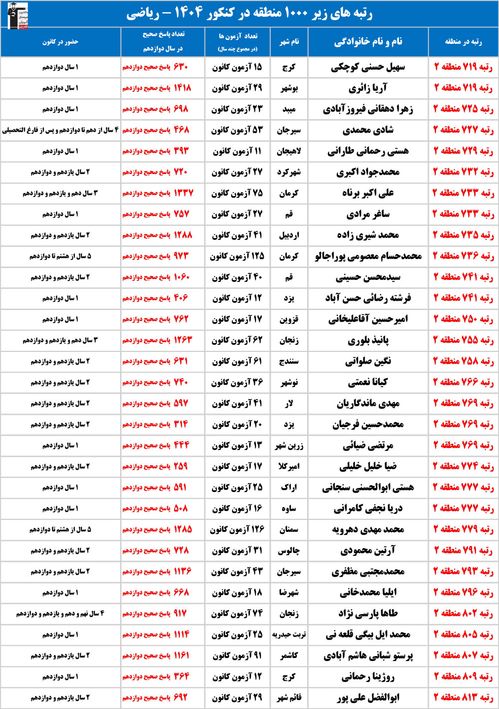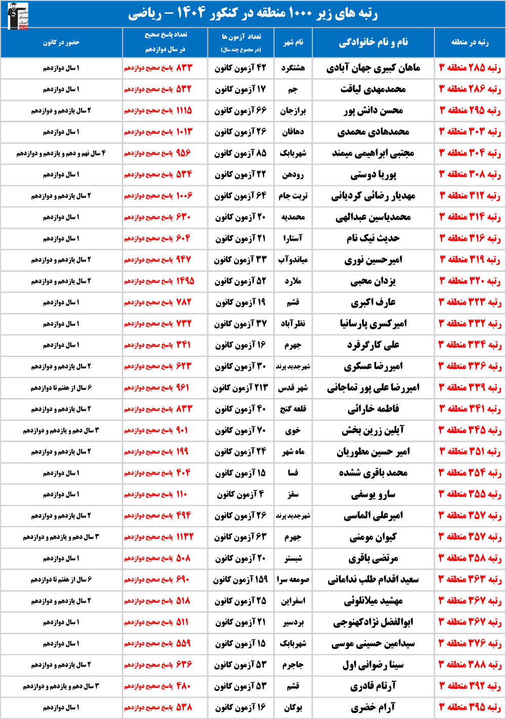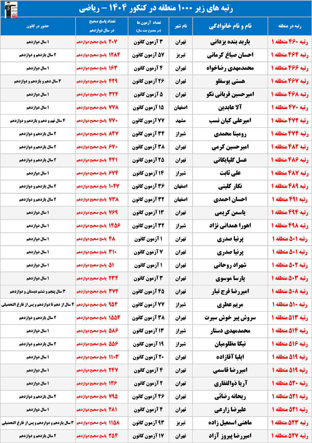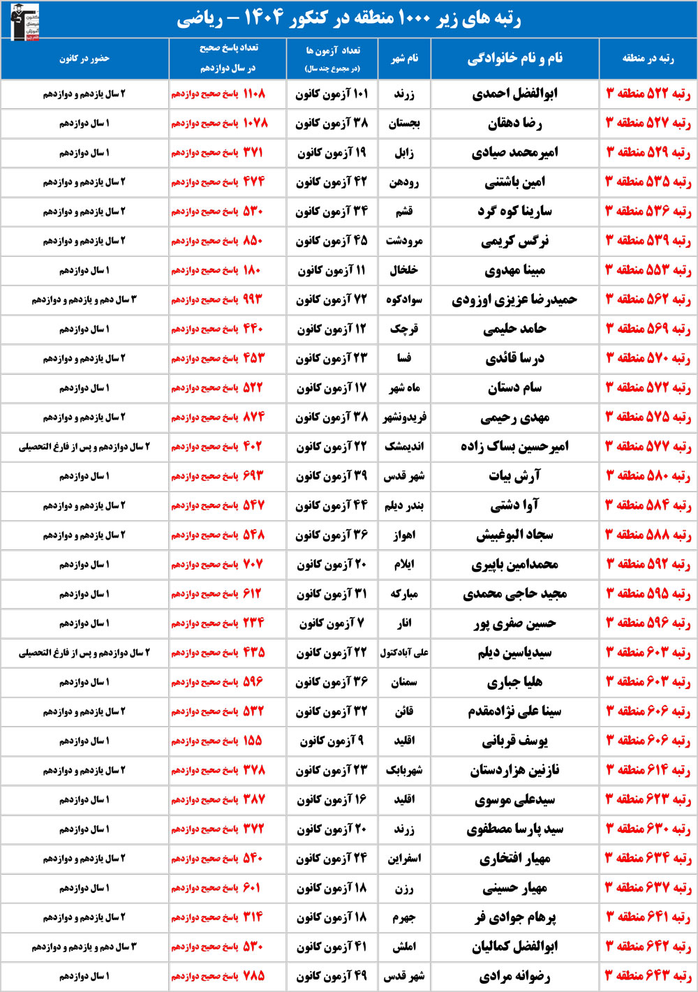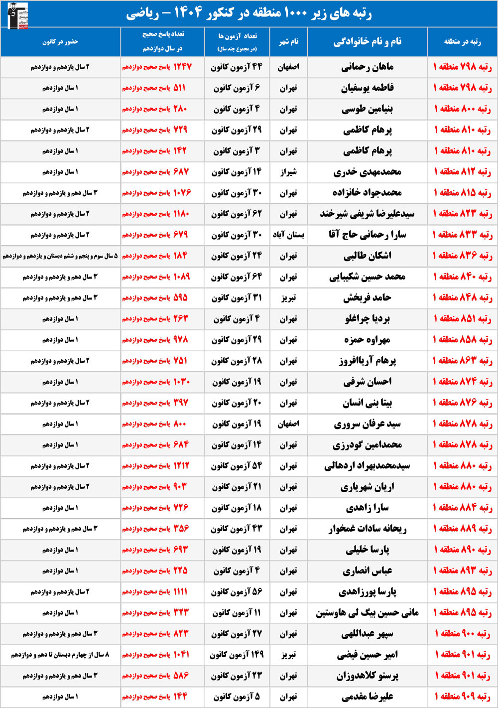 در ادامه با رتبه های زیر 1000 منطقه کانونی در کنکور 1404 در رشته ریاضی آشنا شوید.