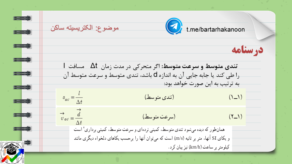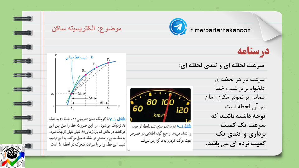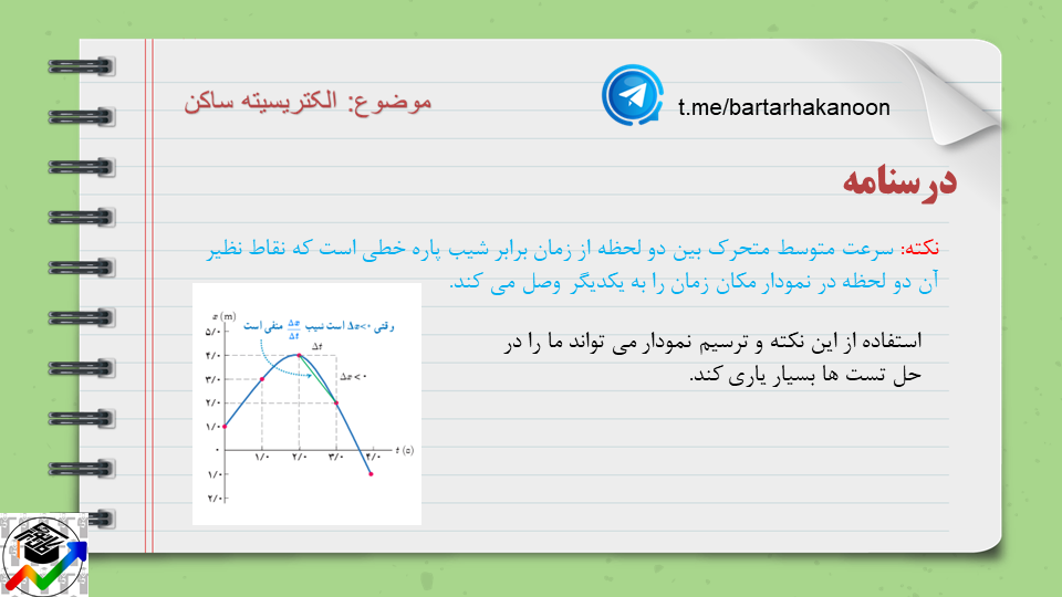 نکته: سرعت متوسط متحرک بین دو لحظه از زمان برابر شیب پاره خطی است که نقاط نظیر آن دو لحظه در نمودار مکان زمان را به یکدیگر وصل می کند.