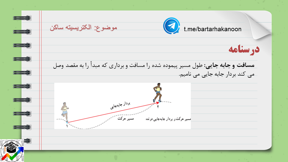 مسافت و جابه جایی: طول مسیر پیموده شده را مسافت و برداری که مبدأ را به مقصد وصل می کند بردار جابه جایی می نامیم.