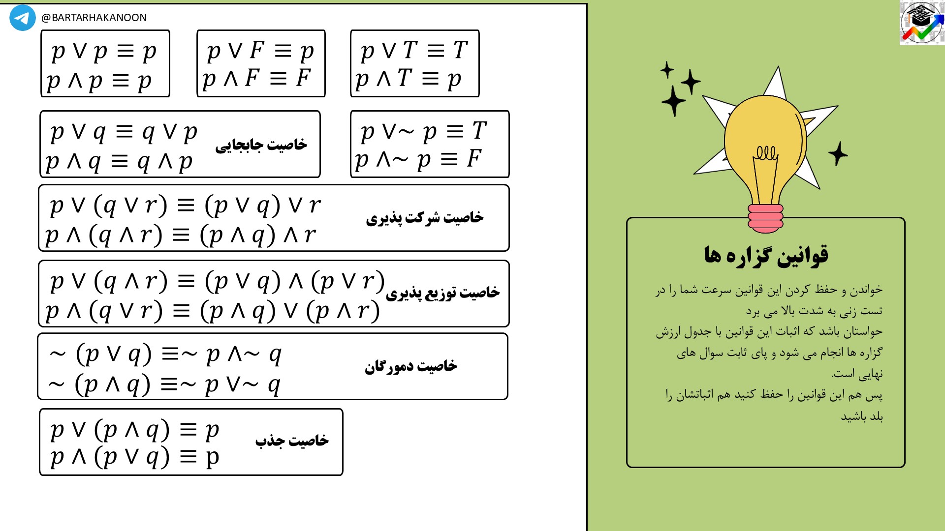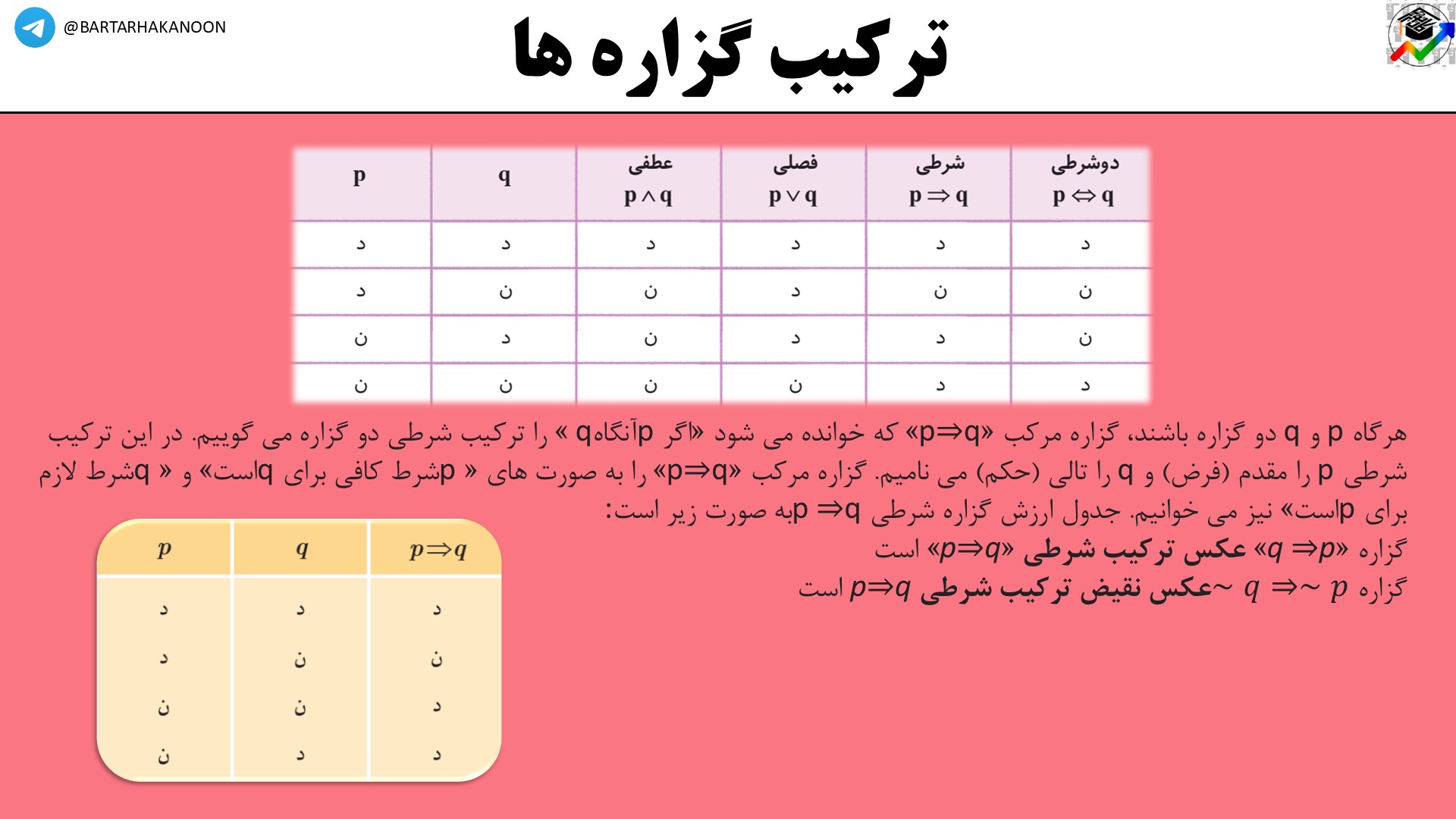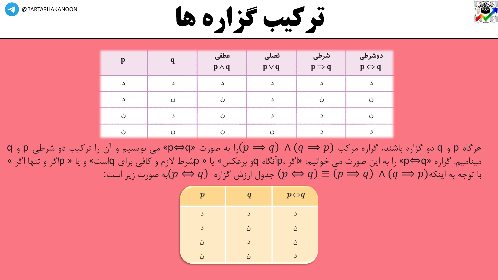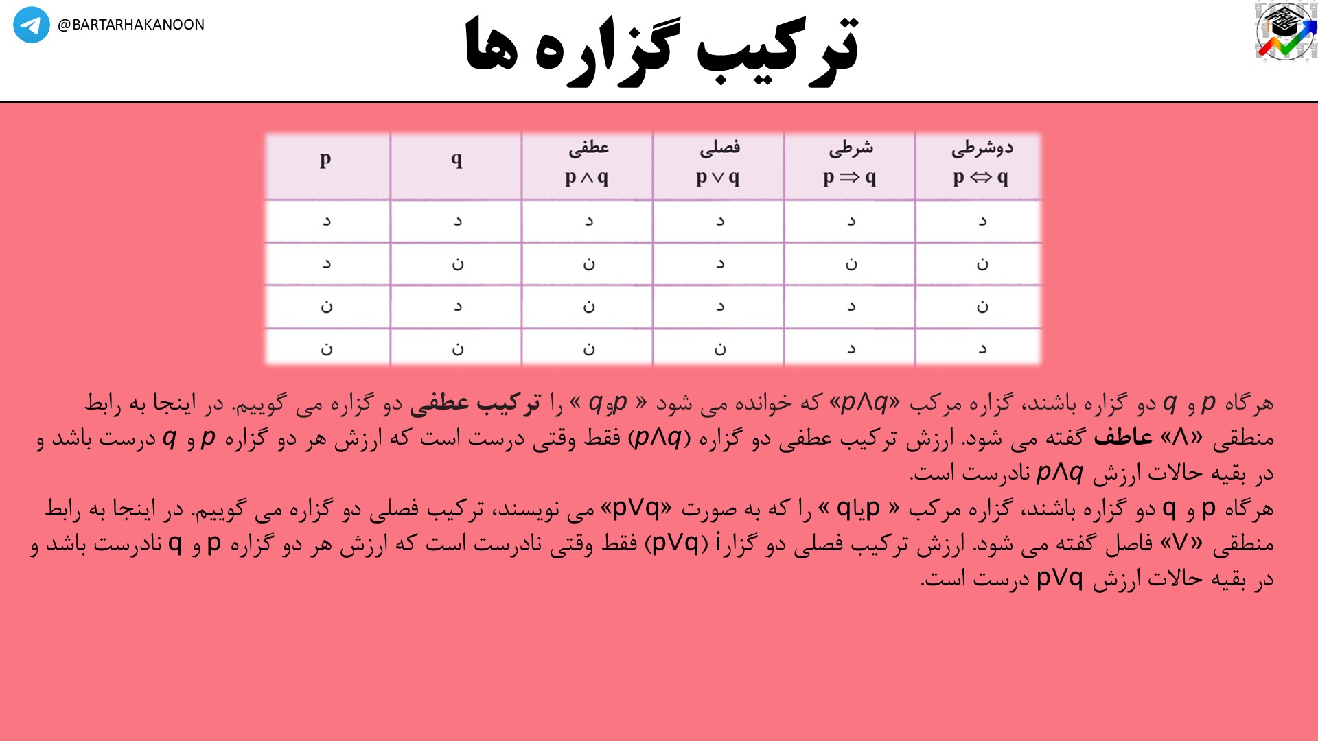 گزاره : جمله ای خبری است که یا راست است یا دروغ. بنابراین جملاتی که خبری نباشند مانند جملات استفهامی، تعجبی و … گزاره نیستند. معمولاً گزاره ها را با حروف r ،q pو … نمایش میدهند. درست یا نادرست بودن یک گزاره را ارزش گزاره میگوییم. ارزشهای دو گزاره pو ، qطبق جدول زیر چهار حالت دارد
