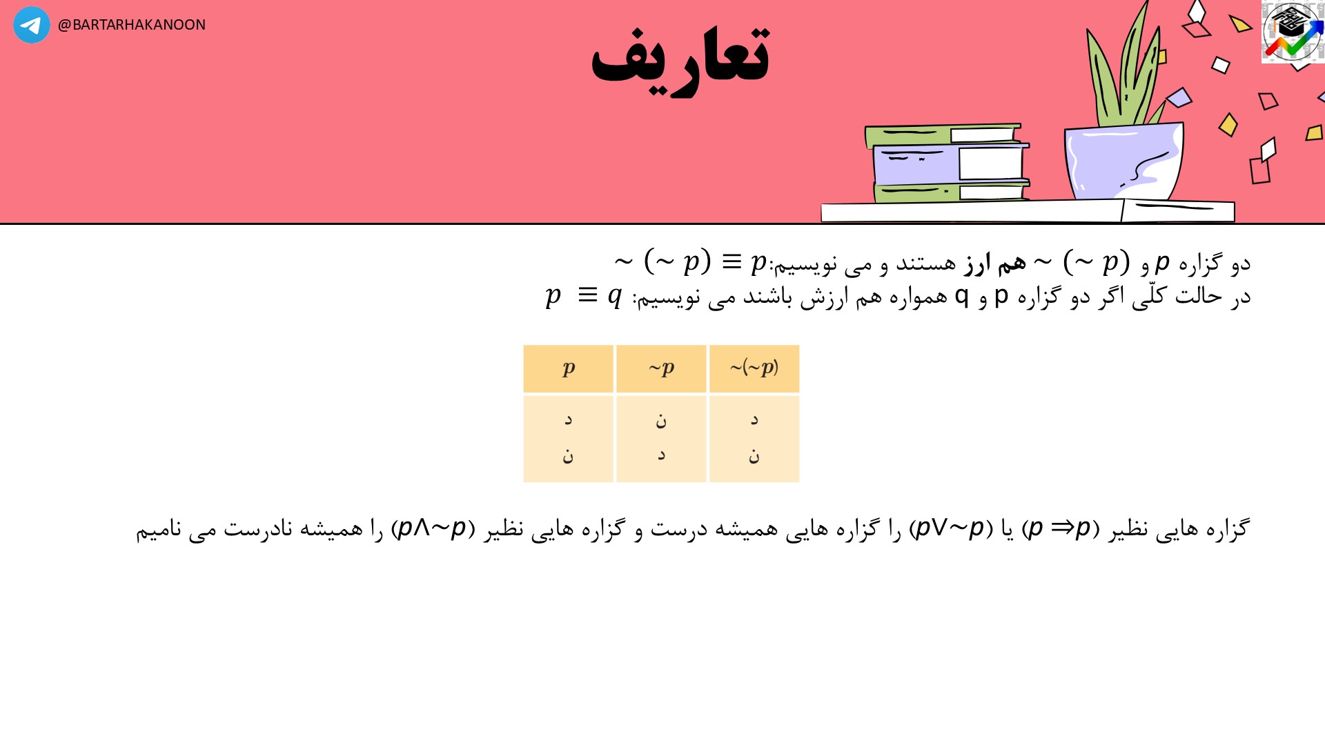 گزاره pدرست باشد، در اینصورت، ارزش گزاره p∼ نادرست است و وقتی که pنادرست باشد،
