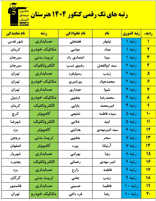 ضمن عرض تبریک به تمامی پذیرفته شدگان کنکور 1404 هنرستان، به اطلاع میرسانیم، تعداد رتبههای تک رقمی هنرستانیهای کانون تا این لحظه 20 رتبه و رتبه های دو رقمی 93 نفر میباشد.