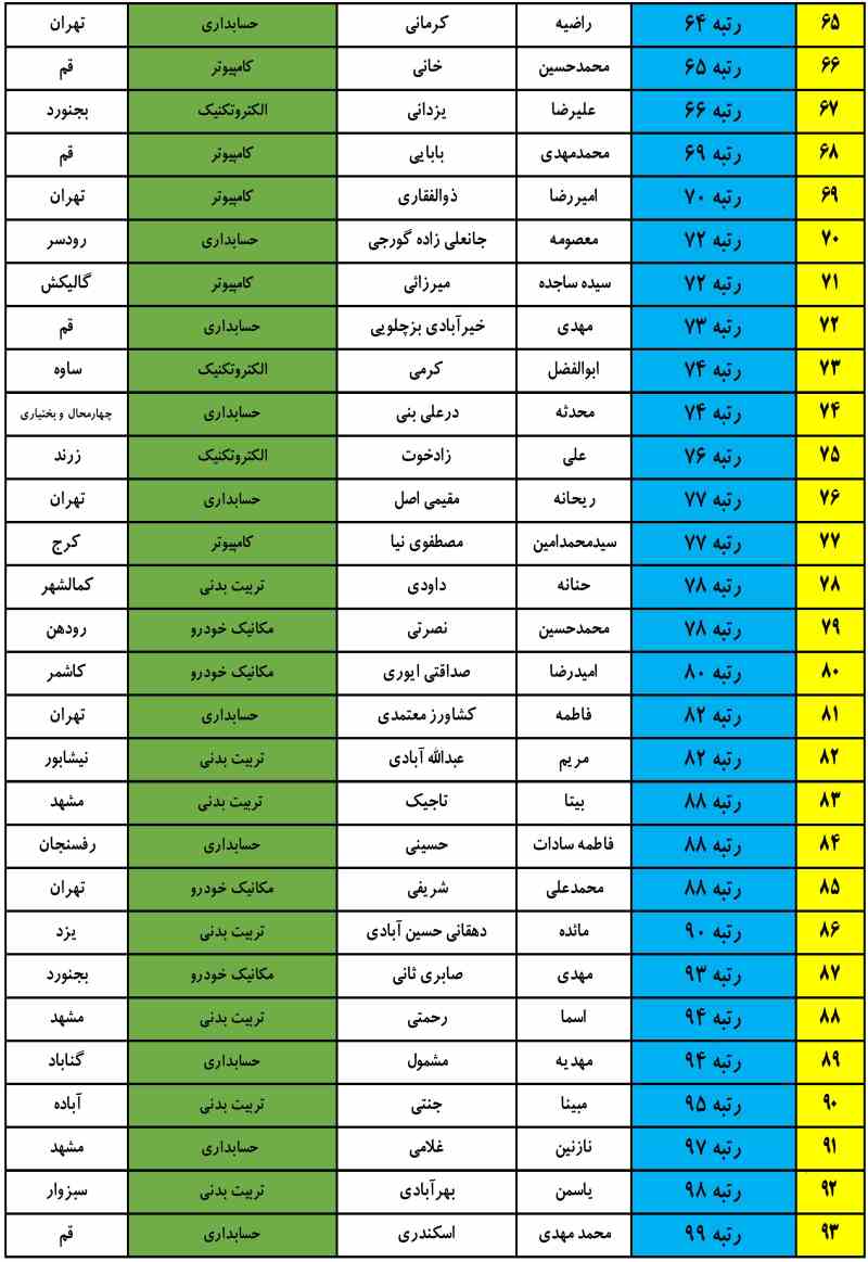 در صورتی که رتبه شما 1 تا 100 می باشد و اسم شما در جدول های زیر نیست، لطفا با تلفن 6463-021 داخلی 1166 و 1136 تماس بگیرید و یا کامنت بگذارید تا با شما تماس گرفته شود.