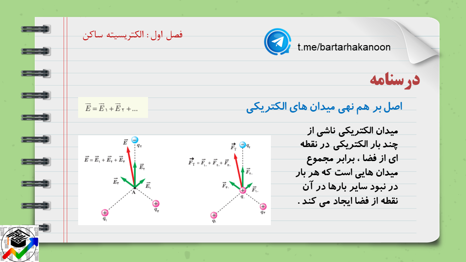میدان الکتریکی ناشی از چند بار الکتریکی در نقطه ای از فضا ، برابر مجموع میدان هایی است که هر بار در نبود سایر بارها در آن نقطه از فضا ایجاد می کند.