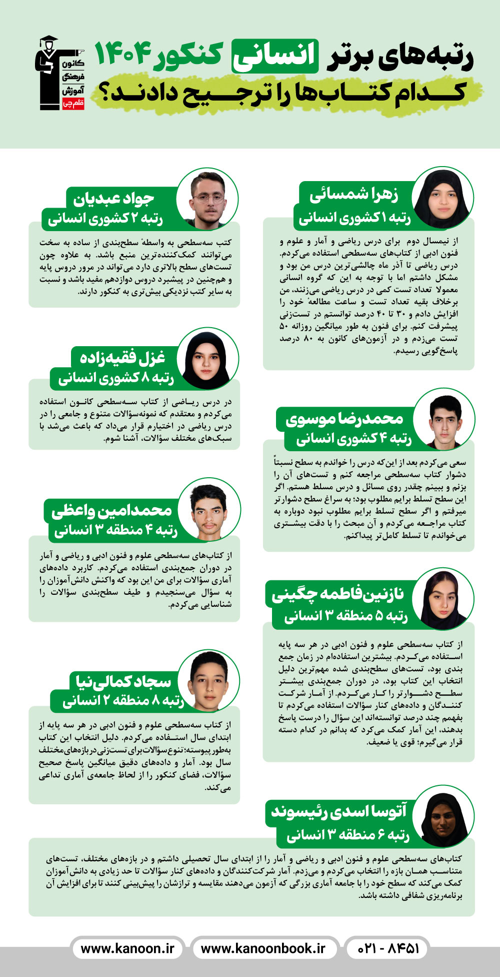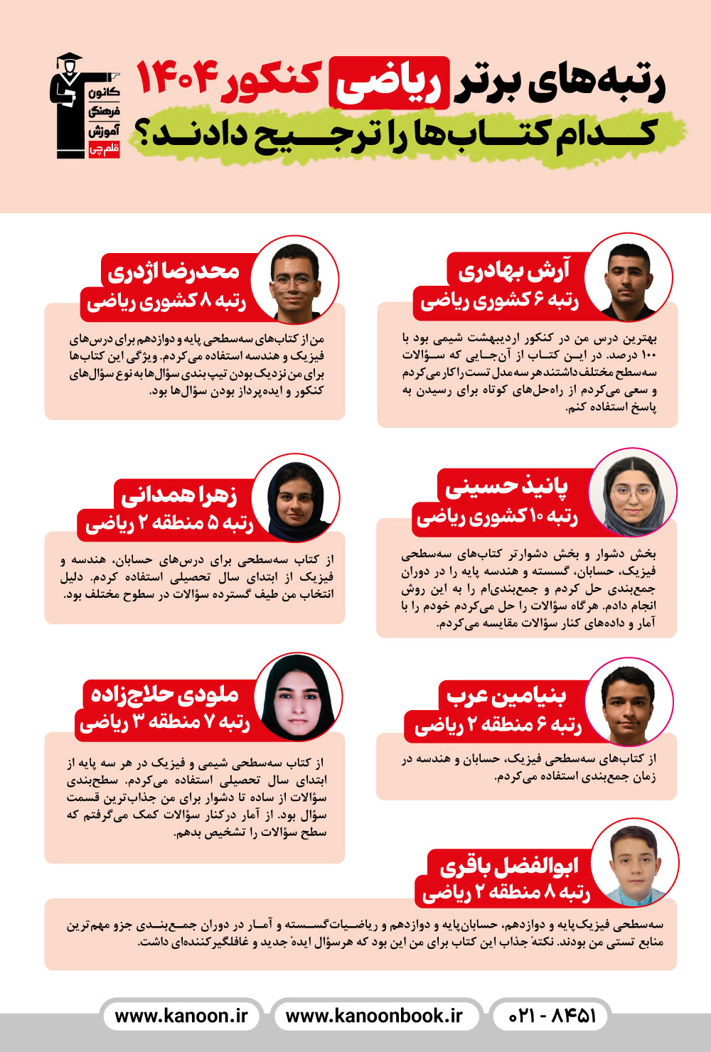 در ادامه مشاهده کنید که رتبه های یک رقمی کنکور 1404 (دانش آموزان کانون فرهنگی آموزش قلم چی) کدام کتاب ها را ترجیح دادند ؟با مراجعه به لینک زیر میتوانید کتابهای مدنظر خود را در سایت کانون بوک kanoonbook.ir سفارش دهید.