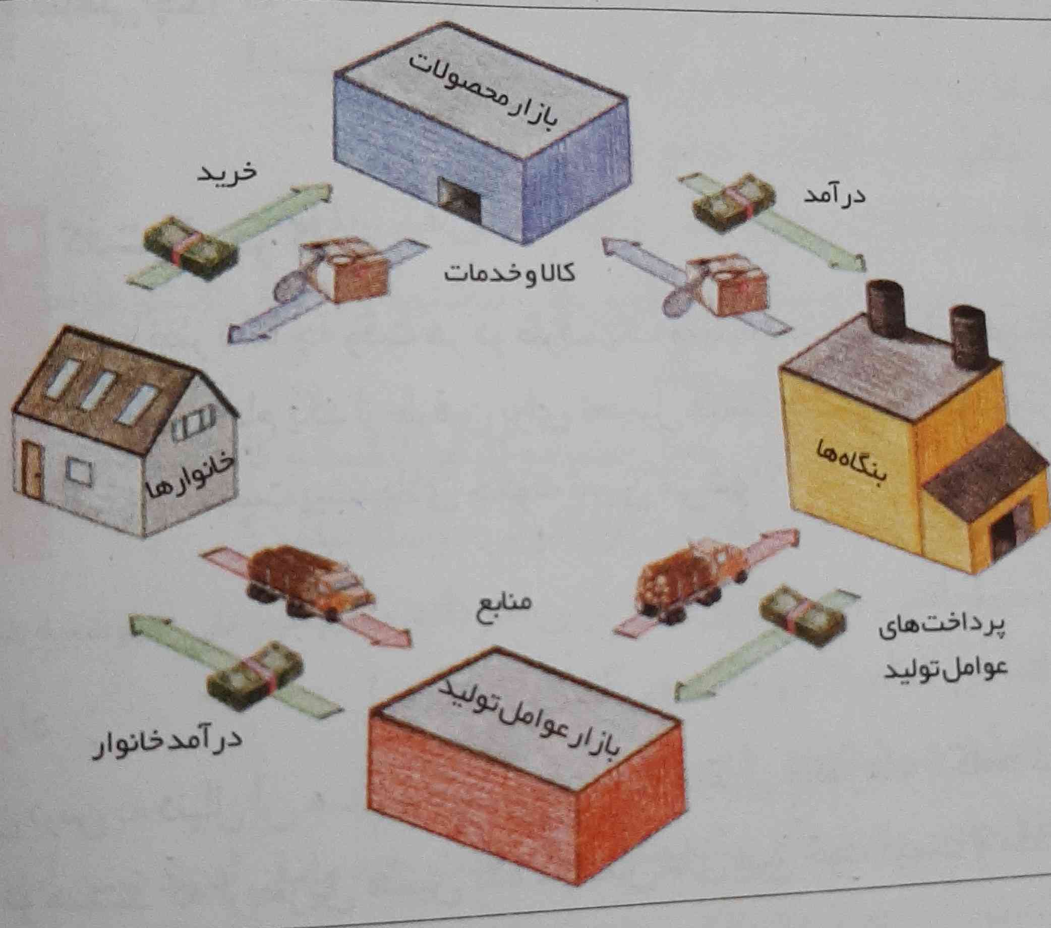 بنگاه ها محصولات خود را به مصرف کننده نهایی یعنی خانوارها میفروشند و در ازای آن پول میگیرند ( جهت فلش درآمد حاصل از فروش محصولات به سمت بنگاه ها و جهت فلش انتفال کالا و خدمات تولیدی به سمت خانوارها )