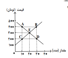 الف) تغییر درآمد فروشندگان در نقطهٔ B نسبت به نقطه تعادل چند تومان است؟ب) مازاد تقاضا در نقطهٔ D نسبت به نقطهٔ C چقدر است؟