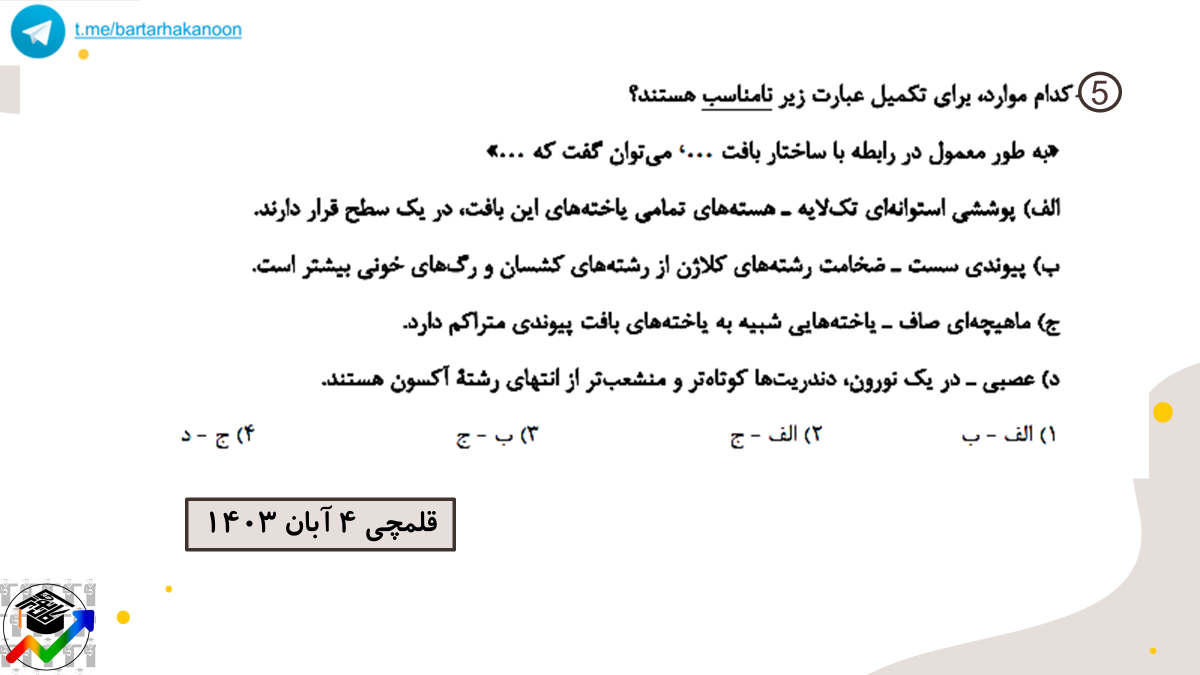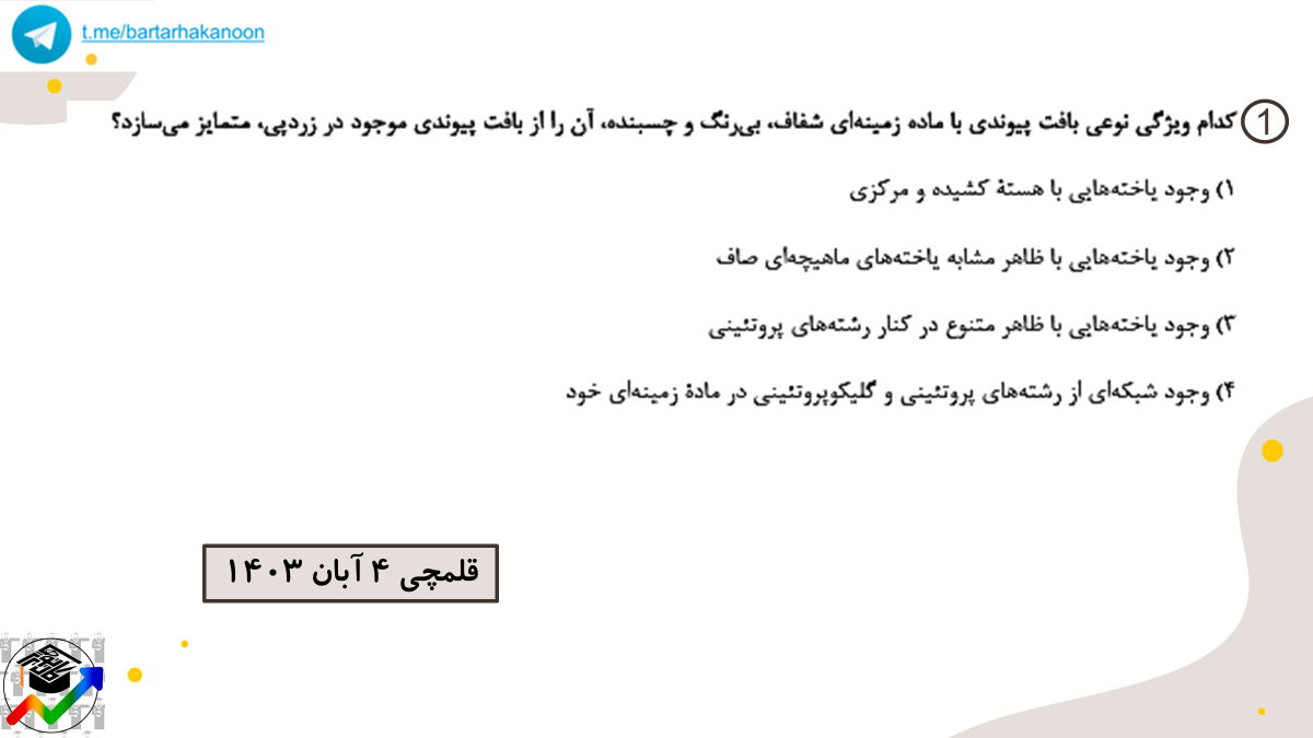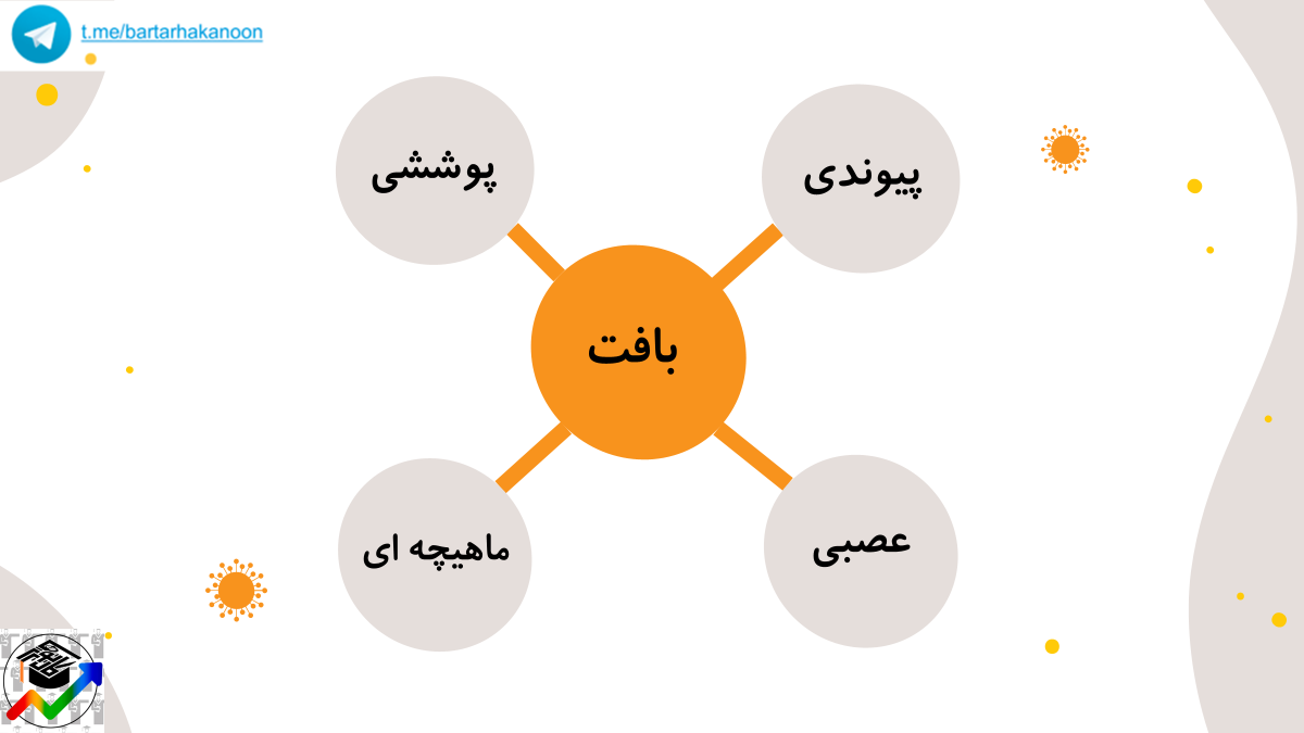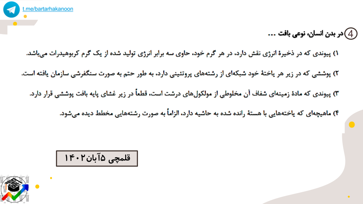 1️⃣ انواع بافت های پیوندی از سه بخش سلول های بافت، ماده زمینه ای و رشته های پروتئینی مانند رشته کشسان و کلاژن است.