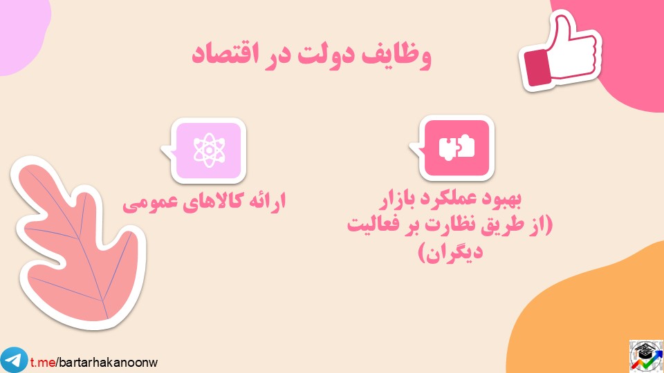 اگر اقتصاد را مثل یک بازی در نظر بگیریم این بازی نیاز به یک داور دارد که در حضور داور بازیکنان ناچار به رعایت یک سری قوانین باشند دولت در راستای این هدف یک سری وظایف دارد این داور با عملکرد درست خود میتواند تخصیص های بهینه ای را برای منابع در اقتصاد ایجاد کند. با اخذ مجوز از دولت به آن اجازه می دهیم بر کارهایمان نظارت کند خودمان را با برنامه هایش هماهنگ کنیم
