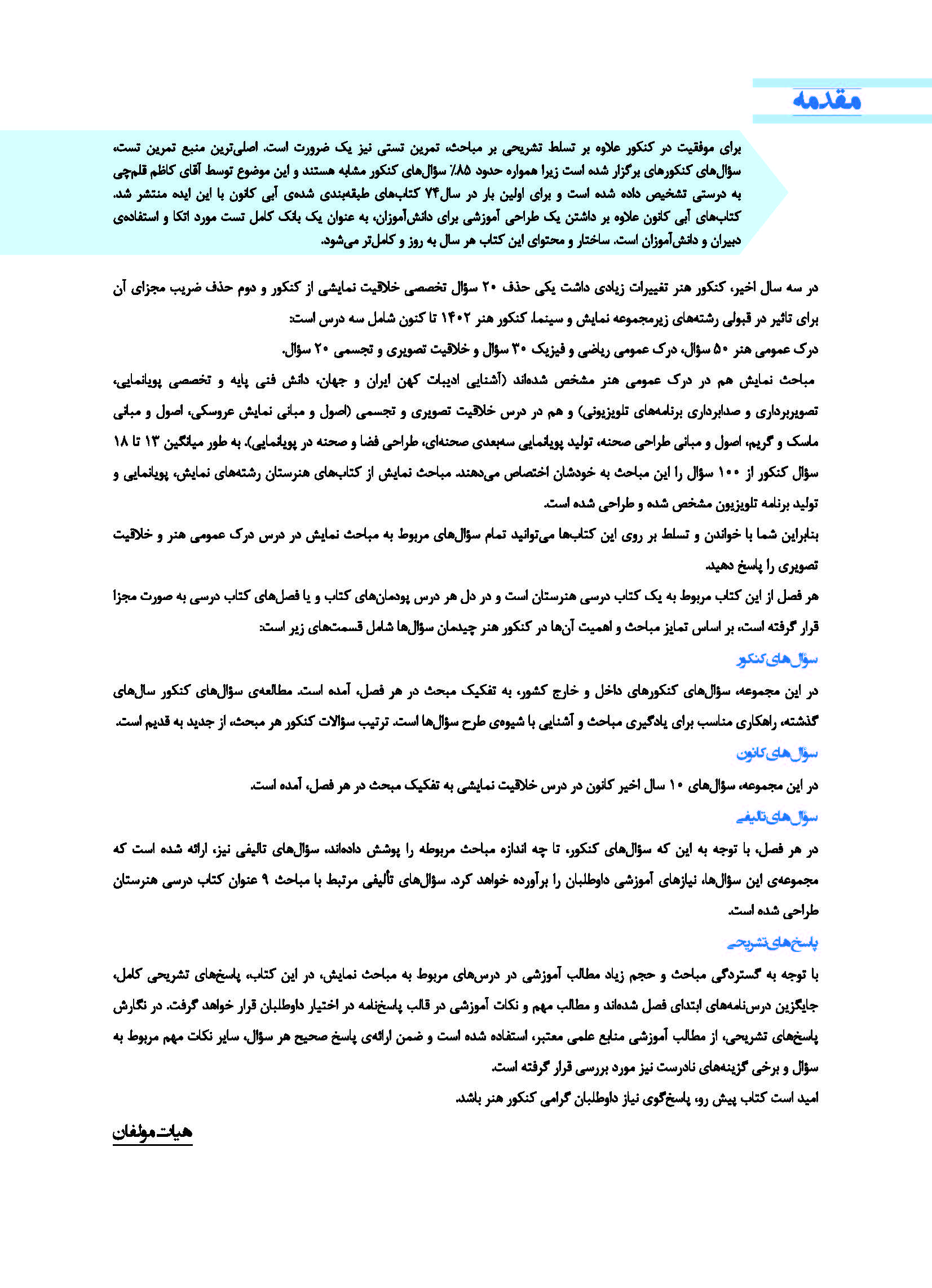 این کتاب دربردارنده تمامی سوالهای کنکورهای سراسری هنر، آزمونهای کانون و تالیف جدید در مباحث نمایش در دو درس درک عمومی هنر ( تاریخ ادبیات، دانش فنی پویانمایی (پایه و تخصصی) و صدابرداری و تصویربرداری برنامه تلویزیون) و خلاقیت تصویری ( نمایش عروسکی، ماسک و گریم، طراحی صحنه تئاتر و انیمیشن، پویانمایی سهبعدی) از سال 1400 تا کنون میباشد.