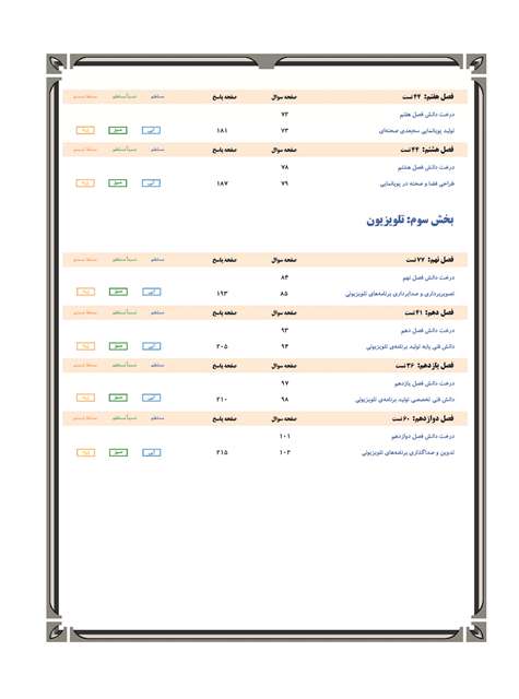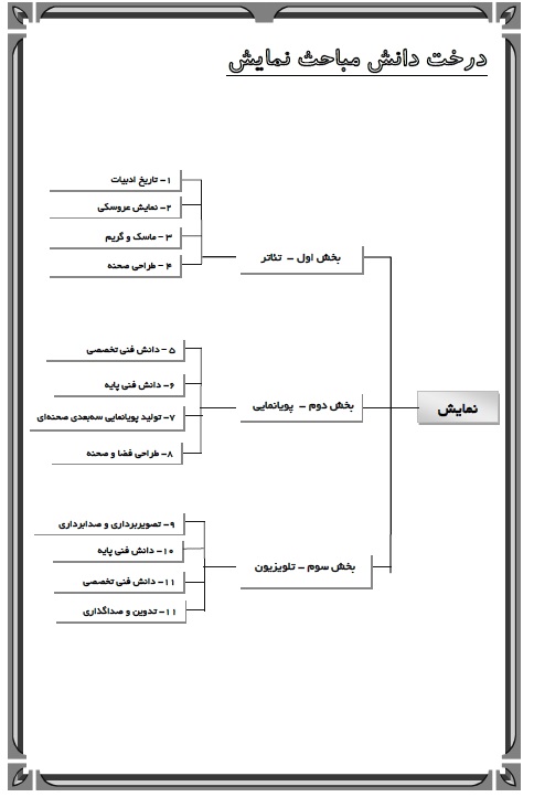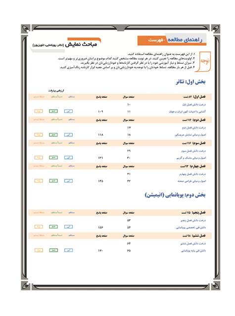 در ابتدای کتاب هر فصل یک درخت دانش از مباحث قرار دارد تا دریک نگاه با مباحث مربوط به تئاتر، پویانمایی (انیمیشن) و تلویزیون آشنا شوید.