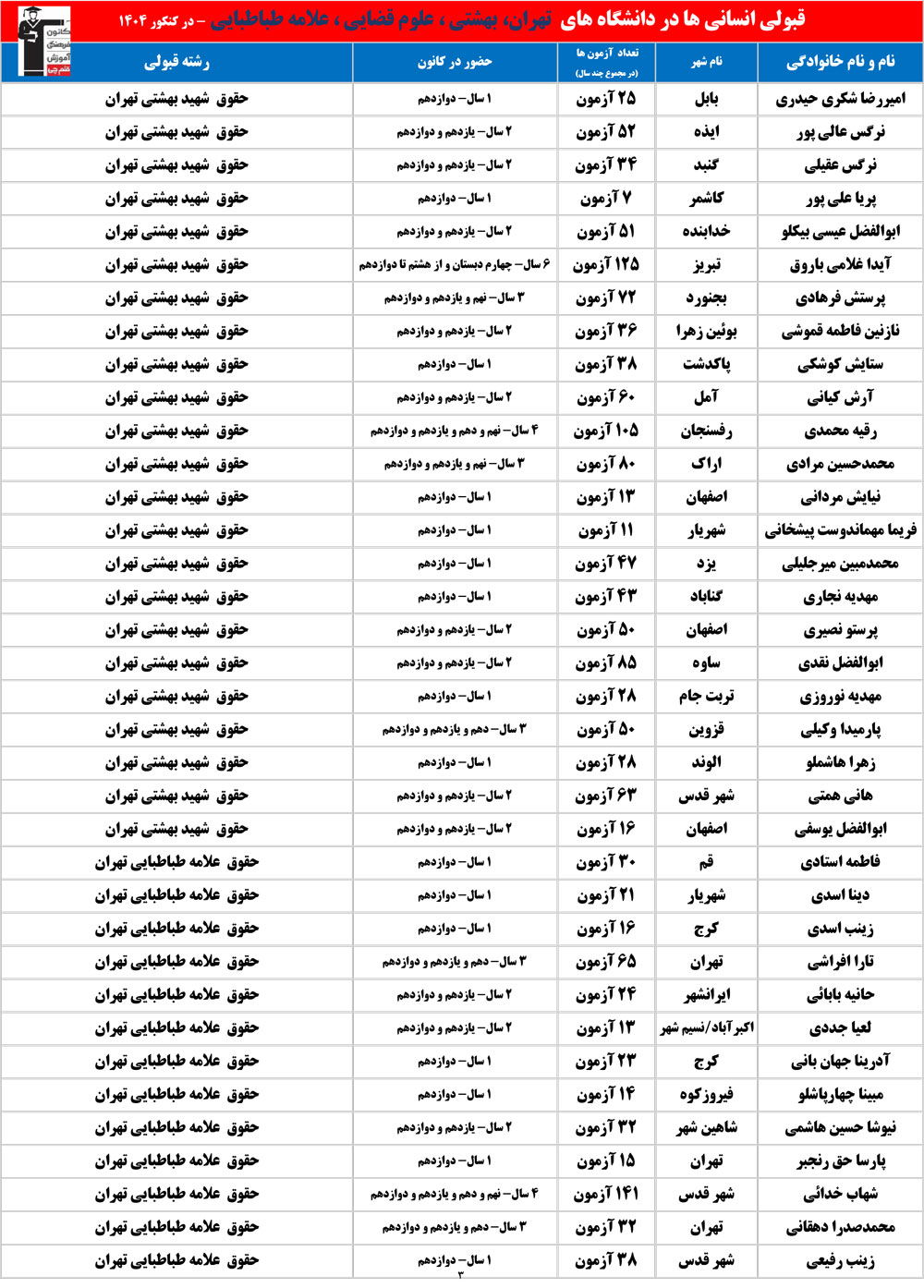 قبولی های کانونی (دانش آموزان کانون فرهنگی آموزش قلم چی) رشته های انسانی دانشگاه های تهران در کنکور 1404 تا این لحظه را در ادامه مشاهده کنید.