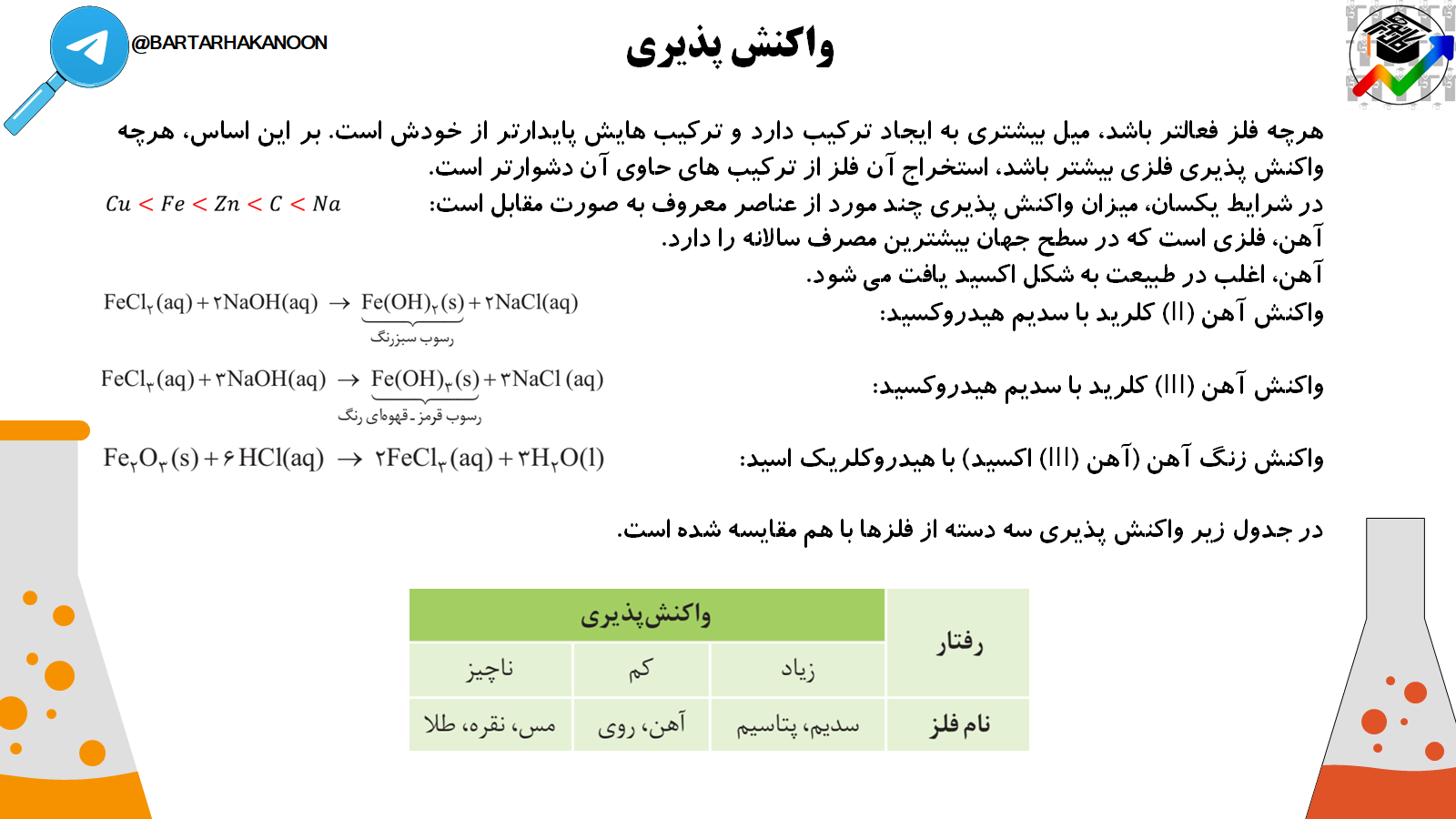 آهن: محکم ـ ساخت در و پنجره فلزی ـ واکنش کند با اکسیژن در هوای مرطوب ـ تبدیل به زنگ آهن