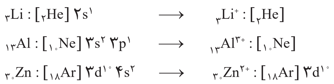رسم آرایش الکترونی یون ها به این صورت است ابتدا بر اساس قاعده آفبا آرایش الکترونی اتم مورد نظر را رسم می کنیم سپس با توجه به بار یون از اتم آن تعداد لازم الکترون را اضافه یا کم می کنیم حواستان باشد که همیشه از زیر لایه آخر کم یا زیاد کنید.