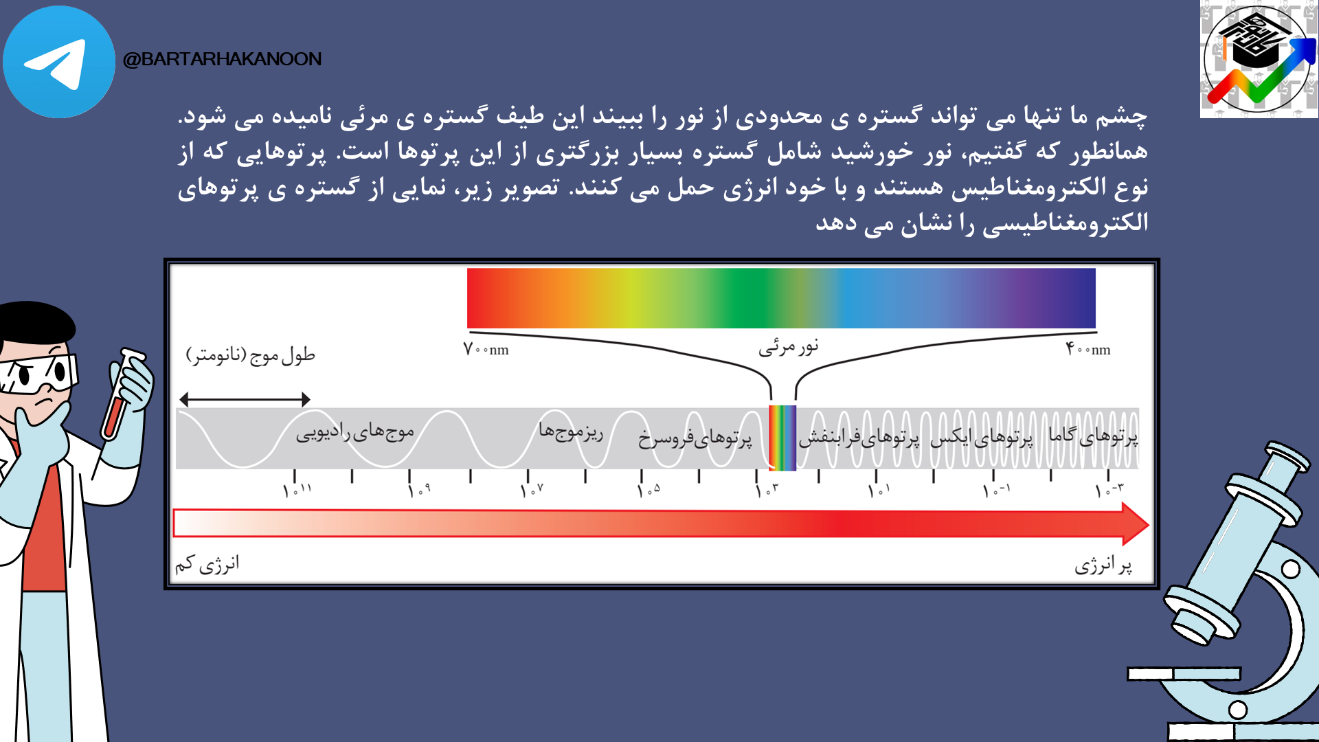 توجه داریم که نور مرئی، بخش کوچکی از پرتوهای الکترومغناطیس را شامل می شود که طول موج آنها در بازه بین 400 تا 700 نانومتر قرار می گیرد. با توجه به تصویر صفحه قبل، هرچه طول موج یک پرتو بیشتر باشد، انرژی حمل شده توسط آن پرتو کمتر خواهد بود . پرتوها در هنگام عبور از منشور، دچار شکست میشوند. هرچه انرژی یک پرتو بیشتر باشد، میزان انحراف آن در منشور نیز بیشتر خواهد بود.
