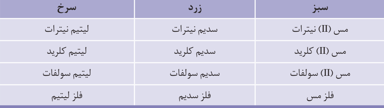 رنگ شعله ی برخی از عناصر فلزی به شرح زیر است: