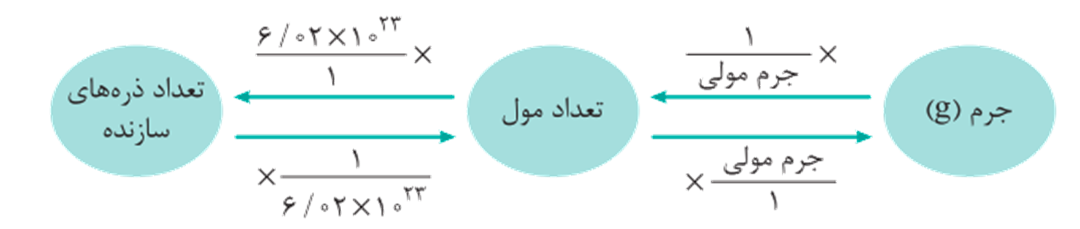 برای حل مسئله هایی که در آن تبدیل جرم، مول و تعداد ذره های سازنده ماده به یکدیگر مطرح است، می توان از روش کسر تبدیل به صورت زیر استفاده کرد: