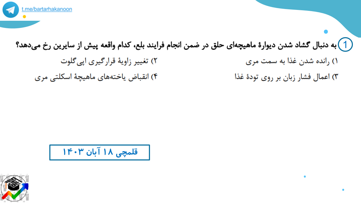 1️⃣ ذرات کوچک غذا را به هم میچسباند و توده غذایی لغزنده ای درست میکند.👈دیواره لوله را از خراشیدگی حفظ و بلع را امکان پذیر میکند.