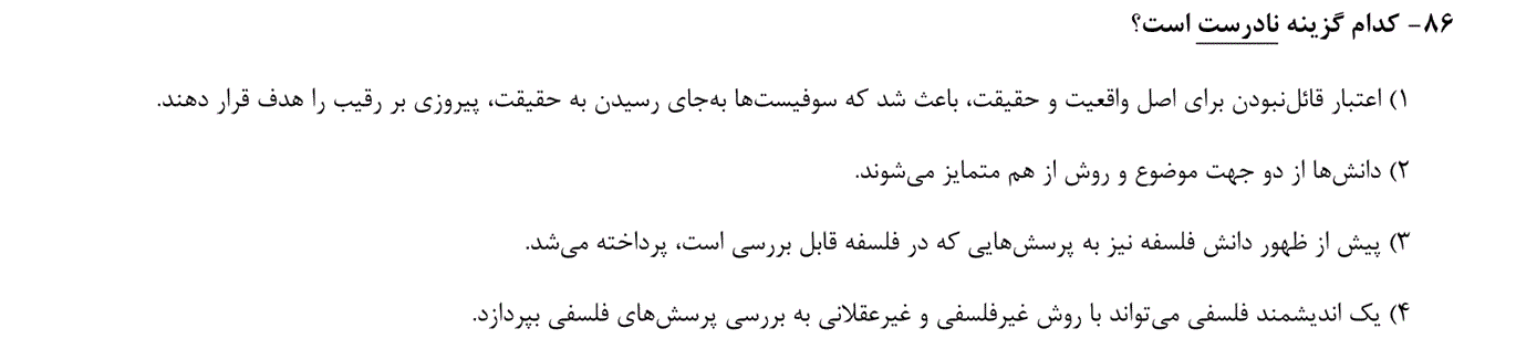 پاسخ درست گزینه ۴ است نه گزینه 1 چون فقط با روش عقلانی و فلسفی میتوان به پاسخ پرسش های بنیادین دست یافت.