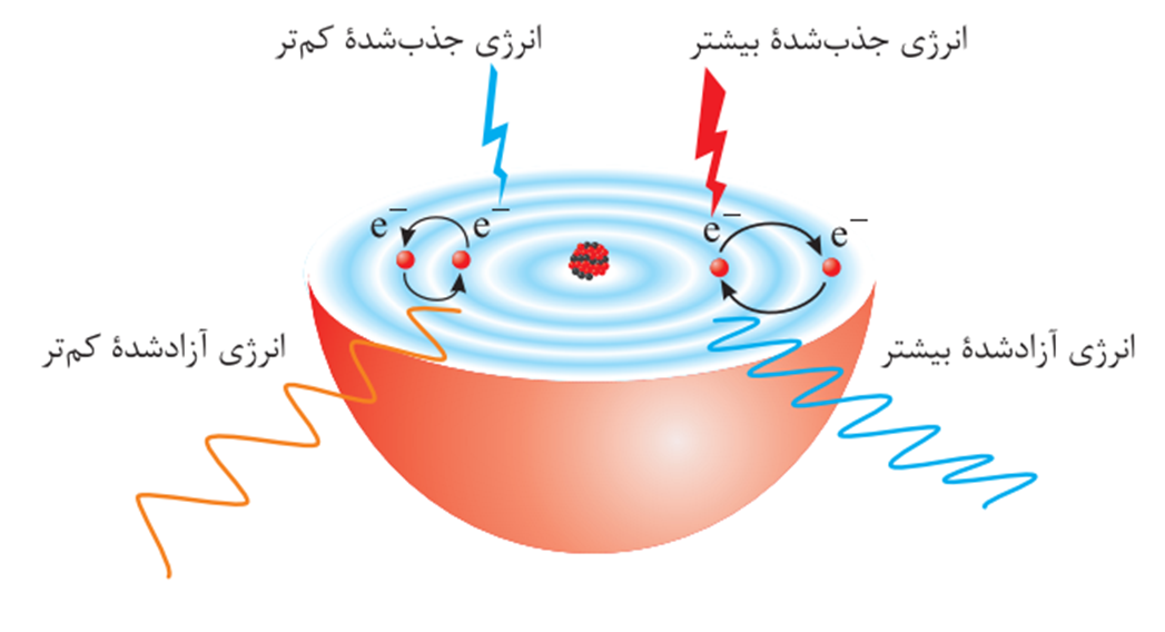 با توجه به اینکه اتم های برانگیخته پرانرژی و نا پایدارند، الکترون ها در آنها تمایل دارند به حالت پایه و اولیه بازگردند و پایدار شوند. هنگام بازگشت الکترون ها از لایه های بالاتر به لایه های پایین تر، الکترون ها انرژی اضافه خود را به صورت نور منتشر می کنند. این نور ها به صورت خطوط با نوارهای رنگی در طیف نشری خطی اتم ها دیده می شود.