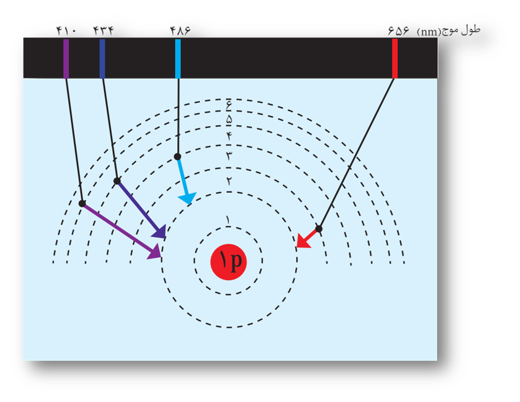 در اتم هیدروژن، در اثر بازگشت الکترون از لایه 3 به 2 یک پرتو قرمز و در اثر بازگشت الکترون از لایه 4 به 2 یک پرتو سبز و در اثر بازگشت الکترون از لایه 5 به 2یک پرتو آبی و در اثر بازگشت الکترون از لایه 6به 2 یک پرتو بنفش گسیل می شود.