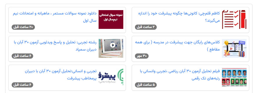 در این قسمت از صفحه شخصی ، اخبار و مطالب ویژهی مقطع و مطالب مناسب برای شما مانند لینک اطلاعات و مقاله ها ، فیلم های تحلیل آزمون ها ، لینک نمونه سوالات امتحانی و ... قابل مشاهده است .