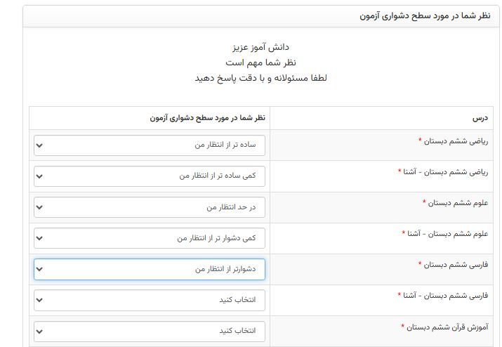 در ساعت 12 روز آزمون ، شما می توانید با مراجعه به صفحه شخصی ، نظر خود را درباره سطح دشواری آزمون برای هر درس اعلام کنید و نتایج نظرخواهی از دوستانتان را هم مشاهده کنید.